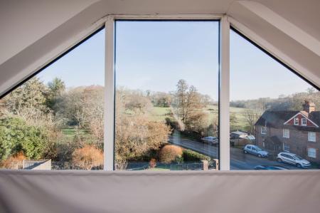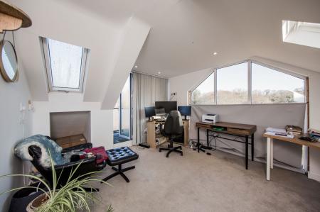 Velux double glazed roof window. A bright and spacious room featuring full height floor to ceiling window enjoying views across the fields and countryside. Victorian style radiator. Eaves storage. Bi-folding doors opening onto the roof terrace with glass balustrade enjoying views across the garden, fields and countryside.