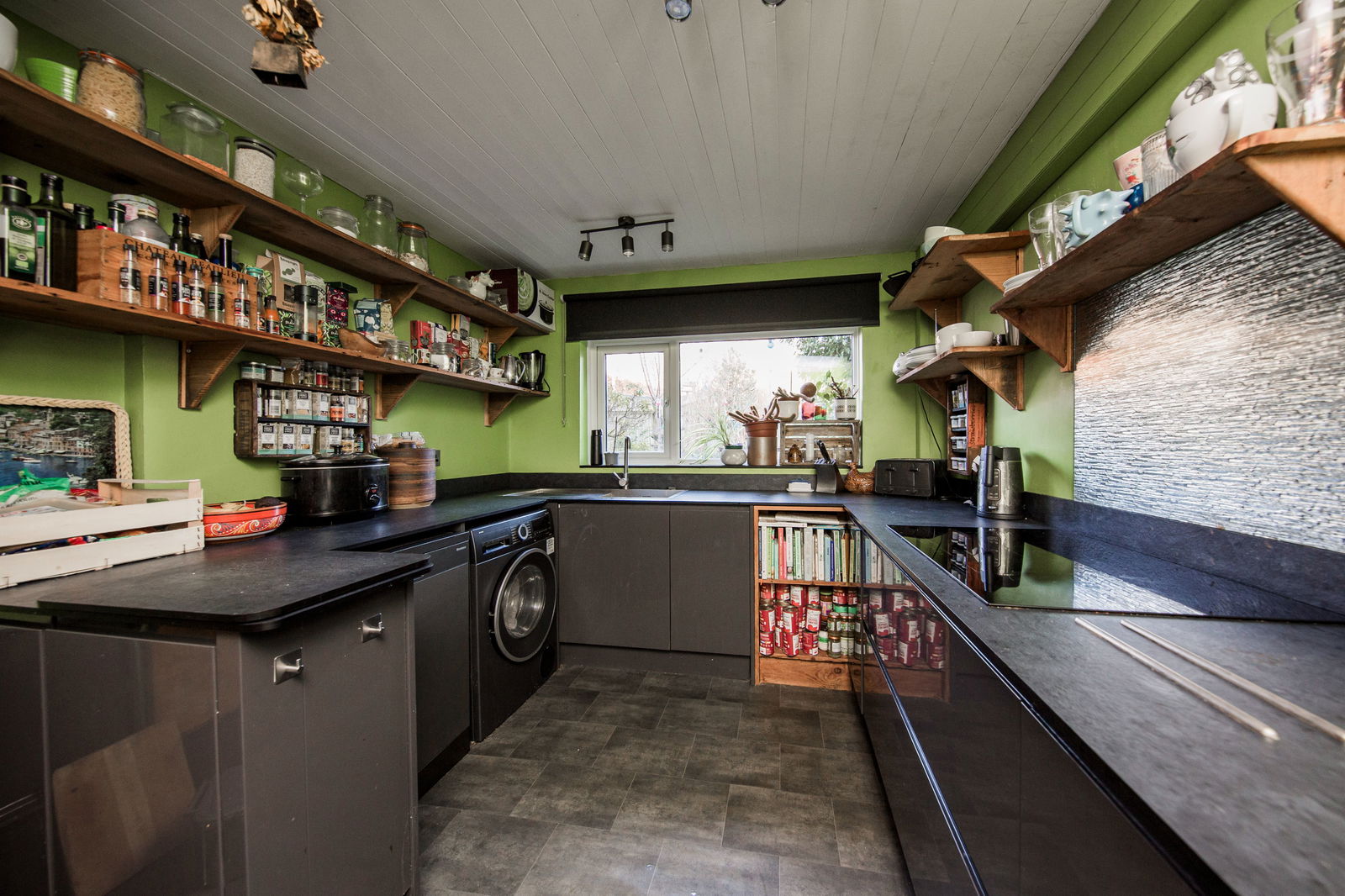 Double glazed window and door overlooking the garden. Modern gloss grey fronted kitchen with slate effect worktops and inset stainless steel sink. Inset electric induction hob, built in oven with microwave above. Space for upright fridge freezer, washing machine and dishwasher. Tile effect flooring. Inset spotlights. Under floor heating.
