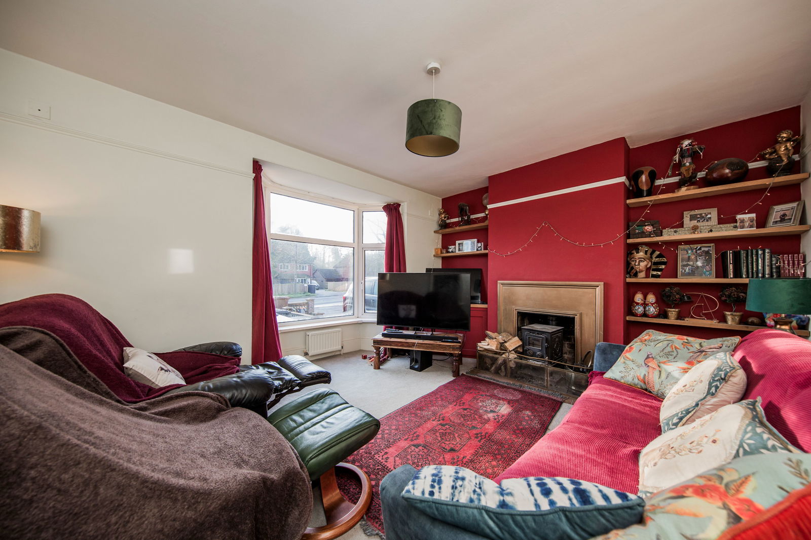 Double glazed windows in bay. Leaded light stained glass window. Feature fire surround with wood burning stove and brick hearth and fitted shelving to both sides. Picture rails. Radiator with decorative cover.