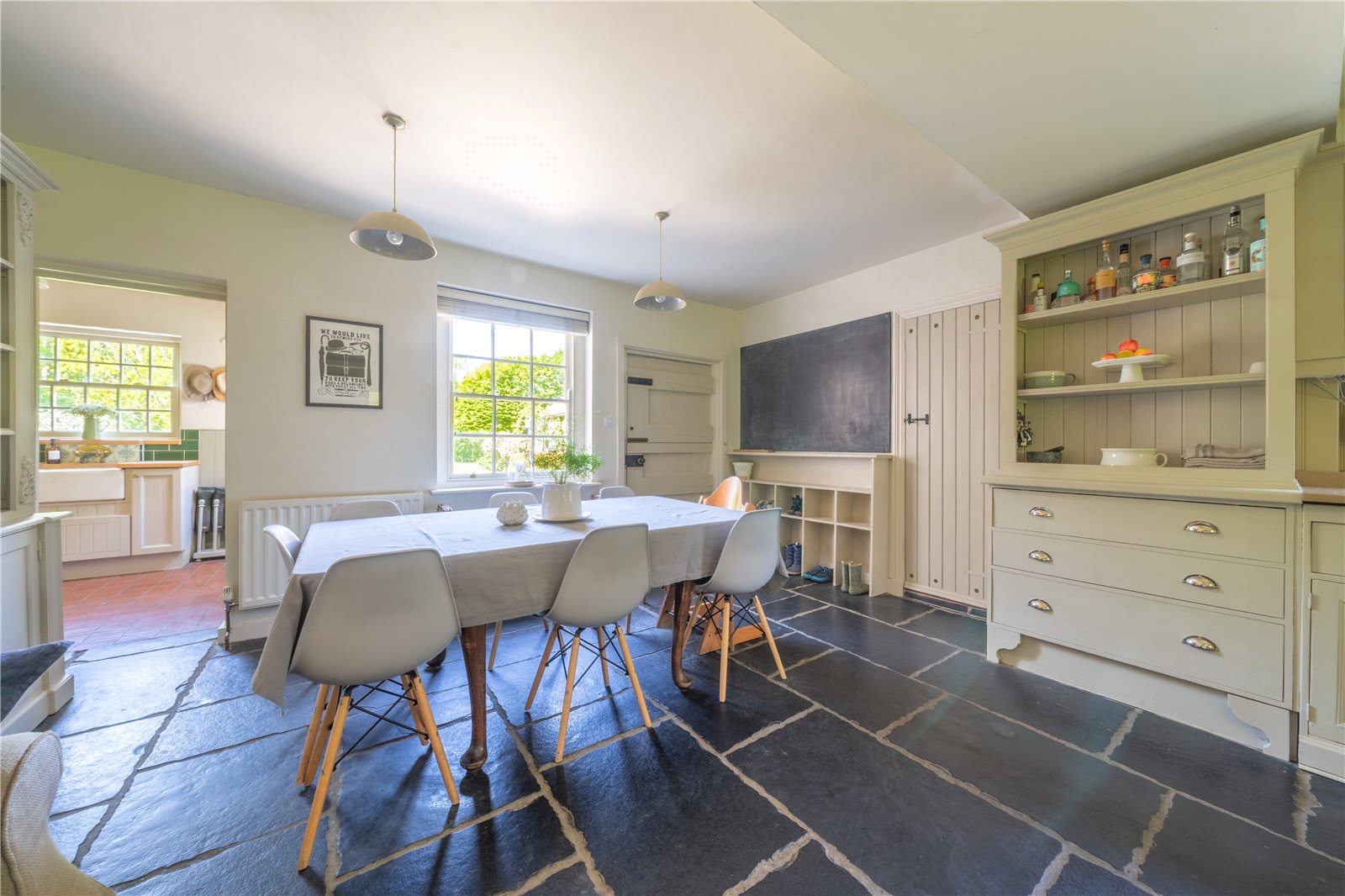 KITCHEN / BREAKFAST ROOM: This spacious, triple aspect family kitchen has ample room for a large farmhouse table, French dresser and sofa as well as the central island unit and plentiful Farrow and Ball painted wooden cabinetry. The slate tiled floor continues through from the hallway, work surfaces are granite and wood, plus butler sink and cream electric AGA with an electric companion hob for summer months. There is a large walk in larder / pantry, a utility / boot room and door straight out onto the terrace with a beautiful view down the rear garden to woodland beyond.