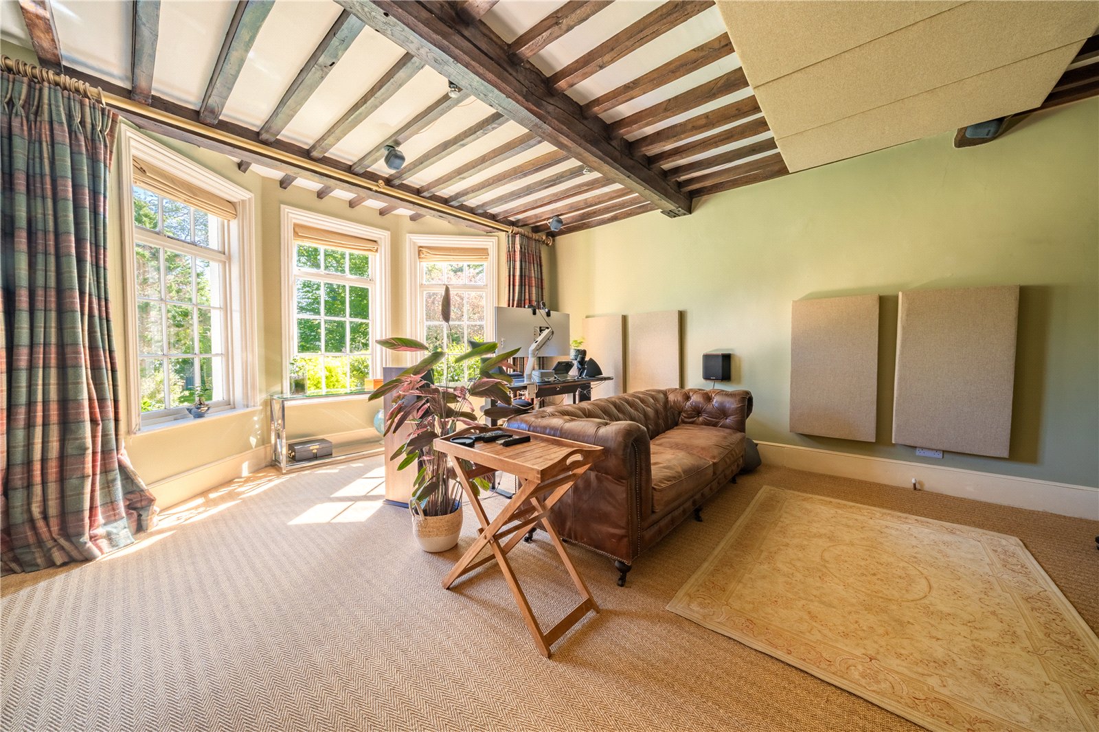 STUDY / LIBRARY / CINEMA ROOM: With exposed beams in the high-level ceiling, herringbone sisal carpet and original marble fireplace. A very large bay sash window overlooks beautiful landscaped gardens to the front.