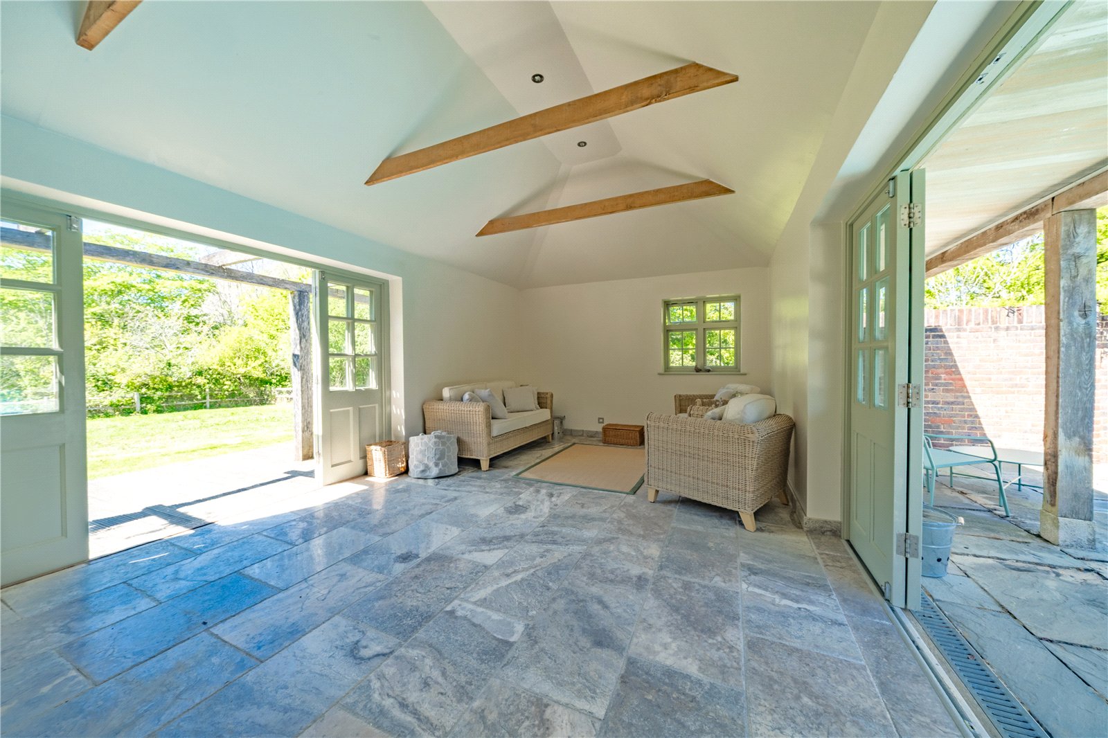 DETACHED POOL HOUSE: Nestled above the wildflower area and overlooking the woodland beyond, sits a wooden deck with oak pergola clad in wisteria. Folding doors open on to the oak beamed, vaulted ceilinged room, with beautiful travertine paved floor. Oak tongue and groove doors lead to the shower room with WC and a separate changing room. The folding doors are mirrored on the opposite side, opening out to create a seamless flow through from the deck to the terrace with veranda and swimming pool, creating a superb indoor / outdoor space ideal for parties.
