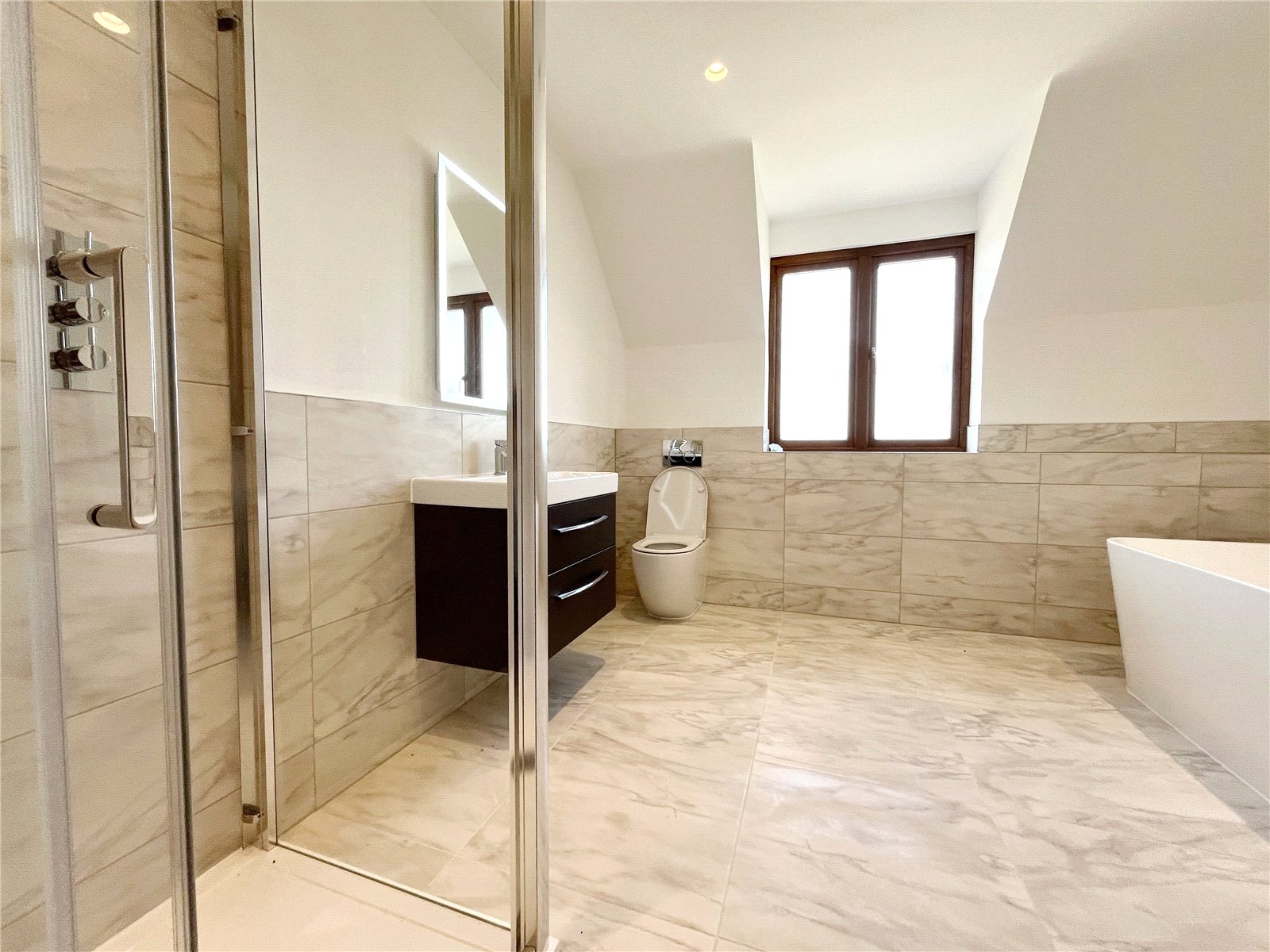 LUXURY FAMILY BATHROOM / SHOWER ROOM: With a feature oval bath, chrome taps, large double sized separate shower with heavy glazed front, heated towel rail / radiator, wash basin, tiled floors double glazed window.