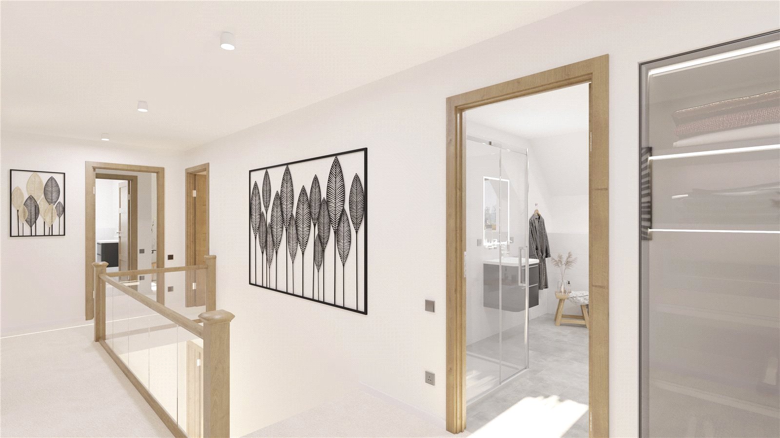 FIRST FLOOR ACCOMMODATION: Feature oak and glazed staircase leading from the main reception hall to first floor landing, with a fabulous outlook to the front gardens. The first-floor landing is carpeted and also has an attractive galleried area, an airing cupboard and a number of oak doors leading off to four double sized upstairs bedrooms (two of which have ensuites), as well as a luxury family bathroom / shower room.