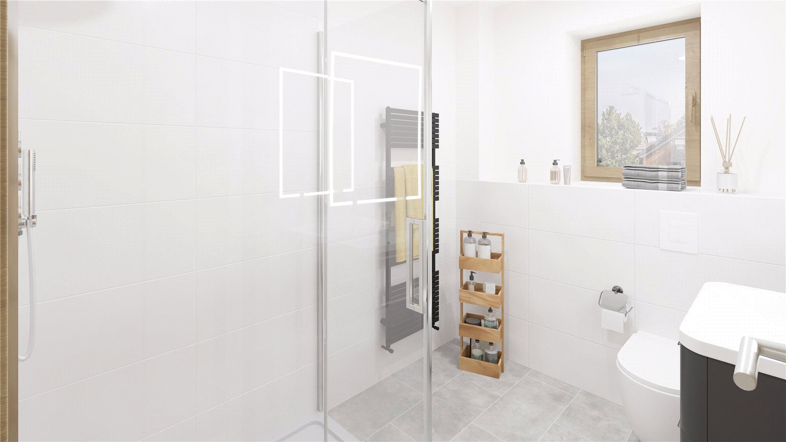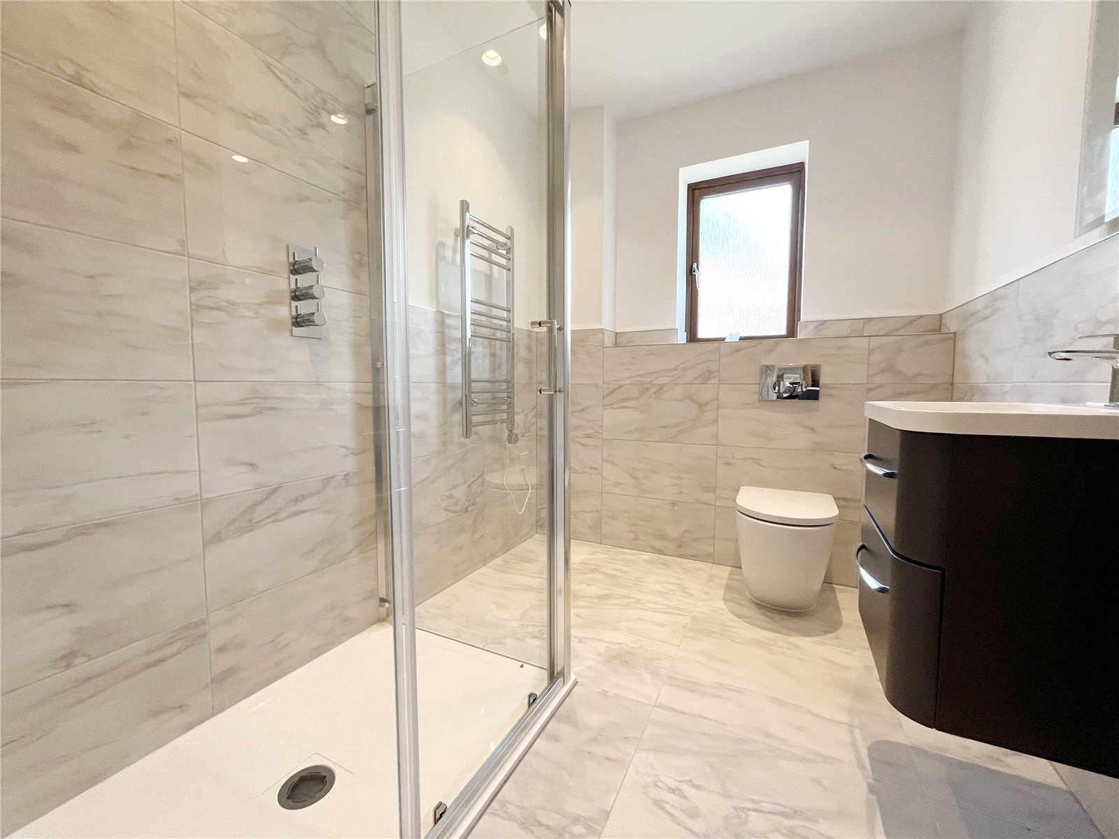 ENSUITE LUXURY SHOWER ROOM FOR BEDROOM TWO: Comprising of a large double sized shower, W.C., wash basin, heated towel rail, double glazed window, tiled floors and part tiled walls.
