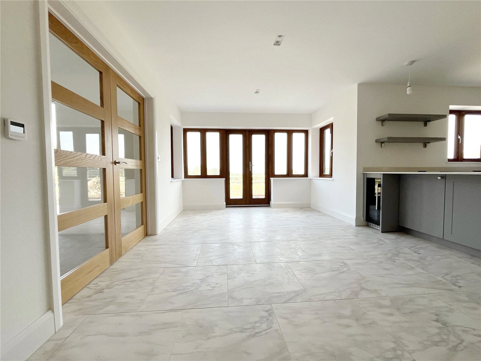 LUXURIOUS OPEN PLAN KITCHEN / BREAKFAST ROOM / DINING ROOM: A triple aspect area, with an impressive modern and elegant Shaker Styled kitchen with integrated appliances and attractive stone worktops, double-glazed windows enjoying stunning far reaching rural views and over the rear gardens, with further double-glazed doors to the rear garden and sun terrace also. Open plan dining room also with tiled floors and enjoying wonderful far-reaching views, Door leading to adjoining Utility room and further double doors leading off also to the triple aspect sitting room.