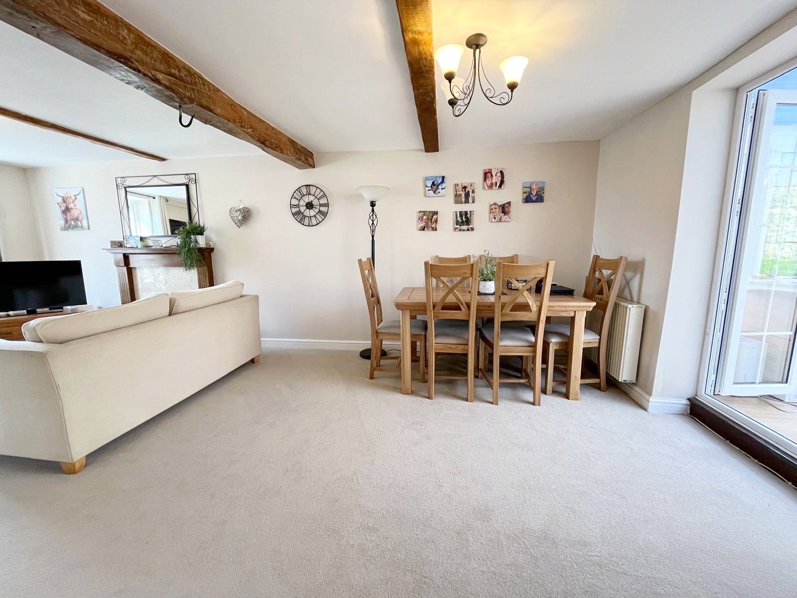 OPEN PLAN SITTING ROOM AND DINING ROOM: A double aspect room with attractive original exposed wooden beams to ceiling (one of which still retains the antique historical butchers hook for the hanging of meat), radiator, double glazed window with aspect to front and views, further radiator, dining area, panelled wooden door to adjoining kitchen, further double-glazed doors to adjoining rear conservatory.