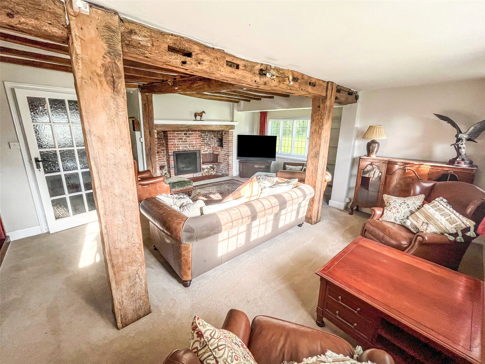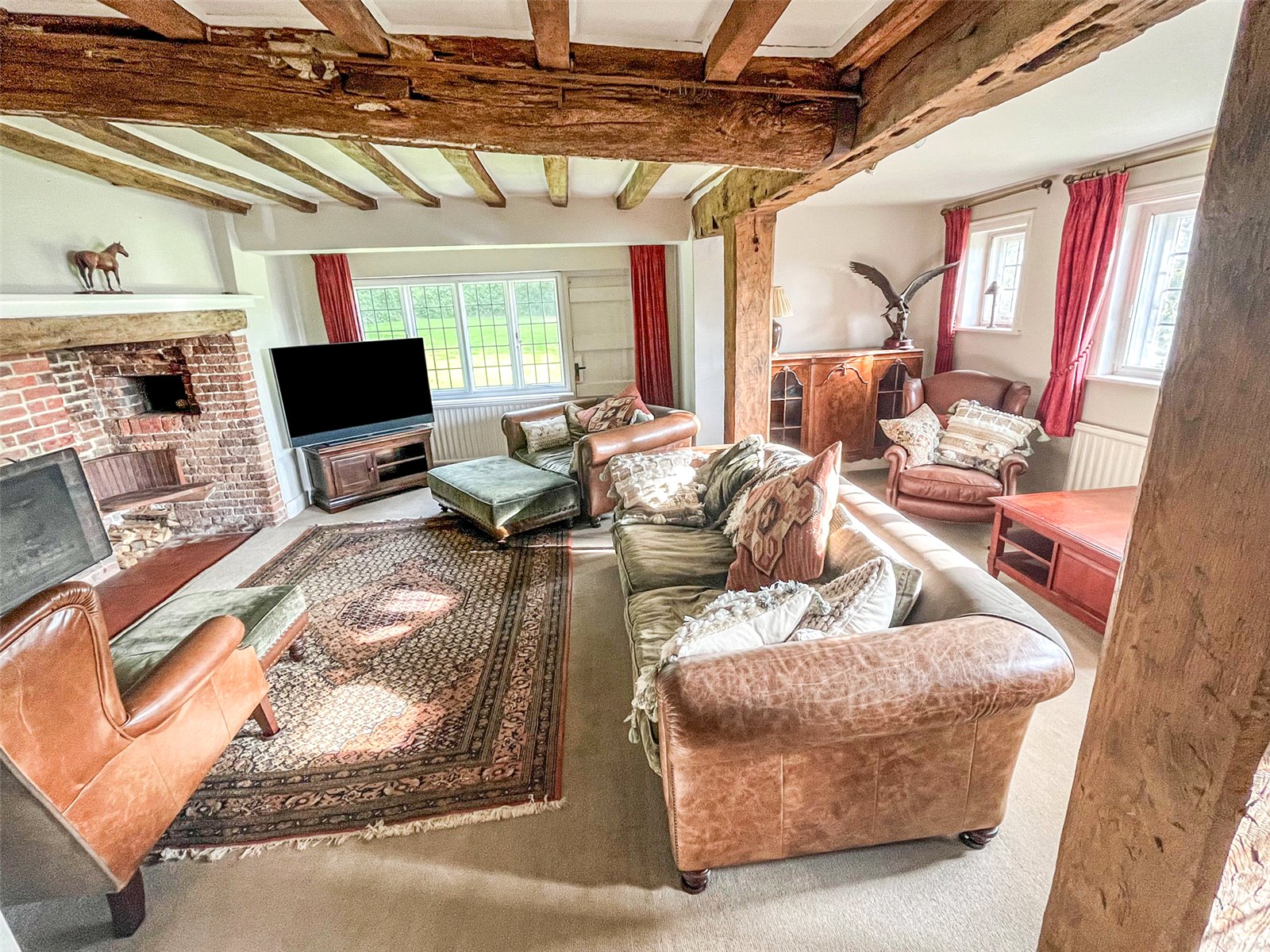 SITTING ROOM: Comprising of a double aspect room with a large feature brick inglenook fireplace with quarry tiled hearth and oak bressummer beam over, high level beamed ceilings radiators, leaded light windows with aspects over the rear and side gardens, as well as far reaching rural views beyond over the property’s circa 46.64 acres.