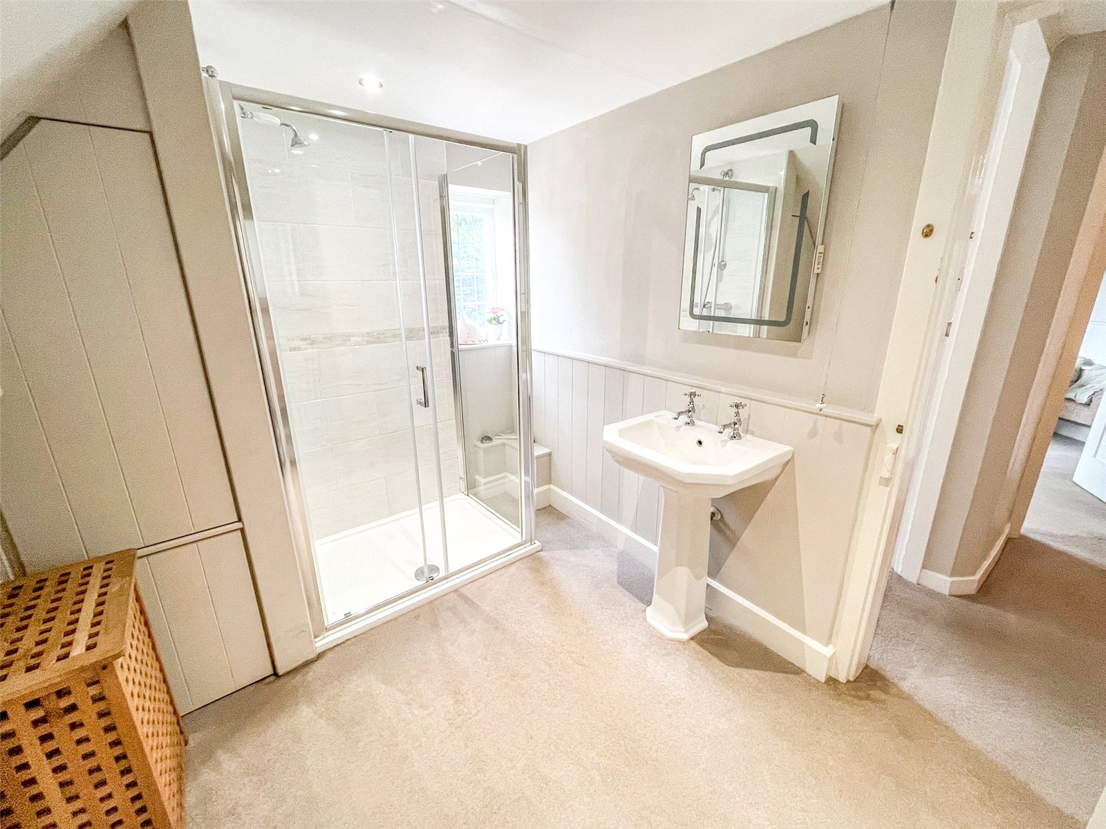 ADDITIONAL LUXURY LARGE SEPARATE FAMILY SHOWER ROOM: Comprising of large double shower with heavy glazed front, pedestal antique styled wash basin with chrome taps, half panelled walls, airing cupboard, downlighting, radiator, window with aspect to front grounds and far-reaching views beyond.