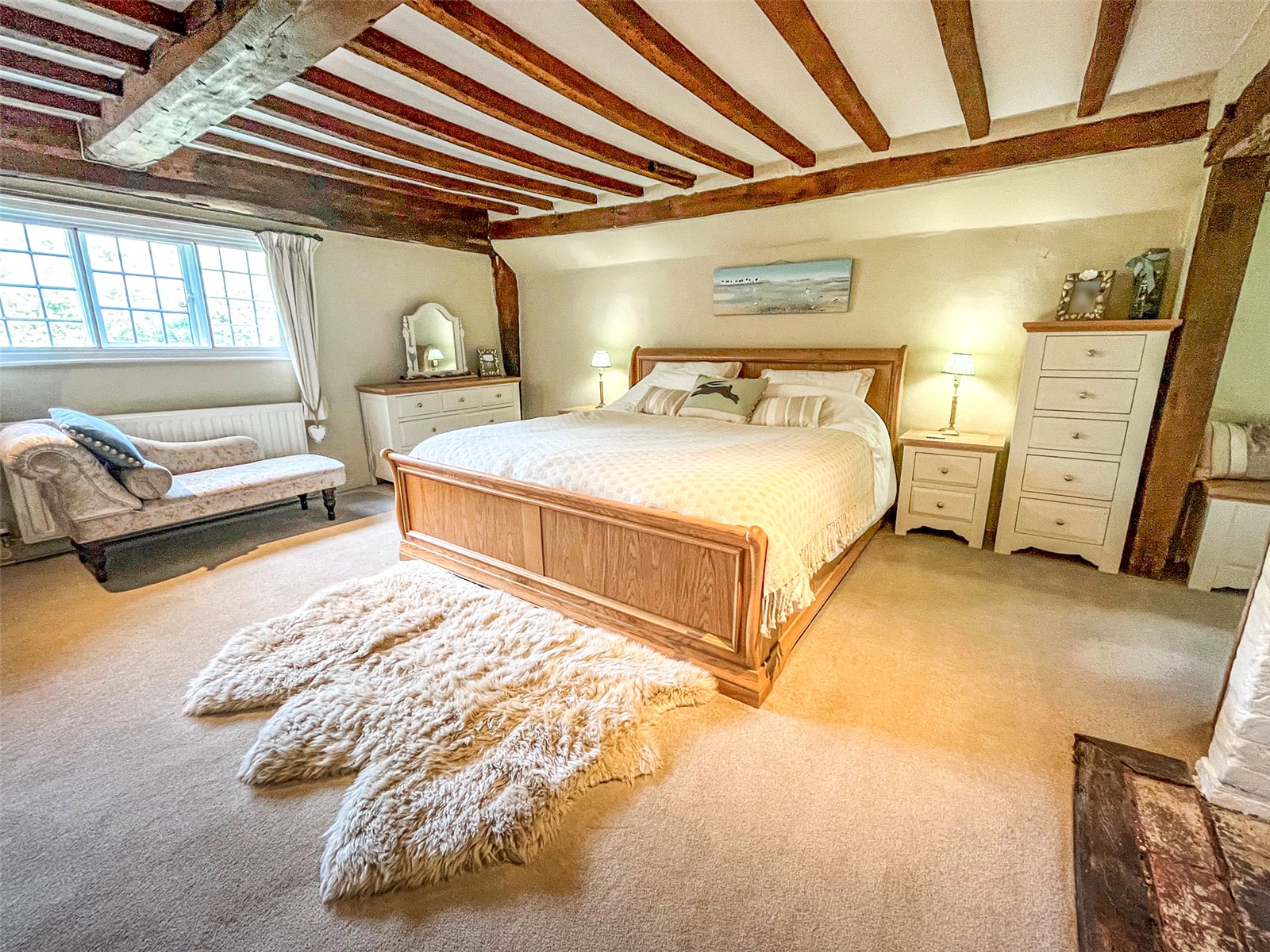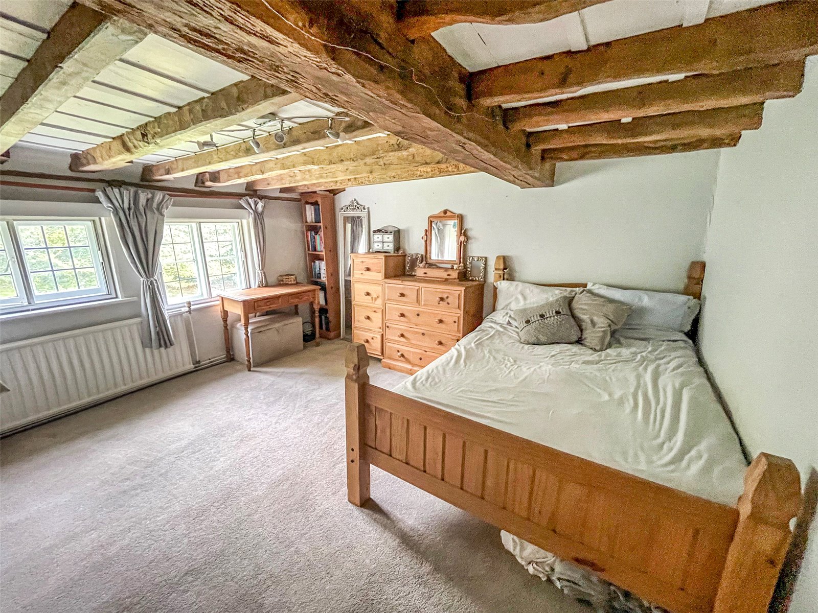BEDROOM THREE: A double sized room with high level beamed ceilings, radiator, windows with aspect over the rear gardens and lovely far reaching rural views beyond over the property’s 46.64 acres and the surrounding countryside.