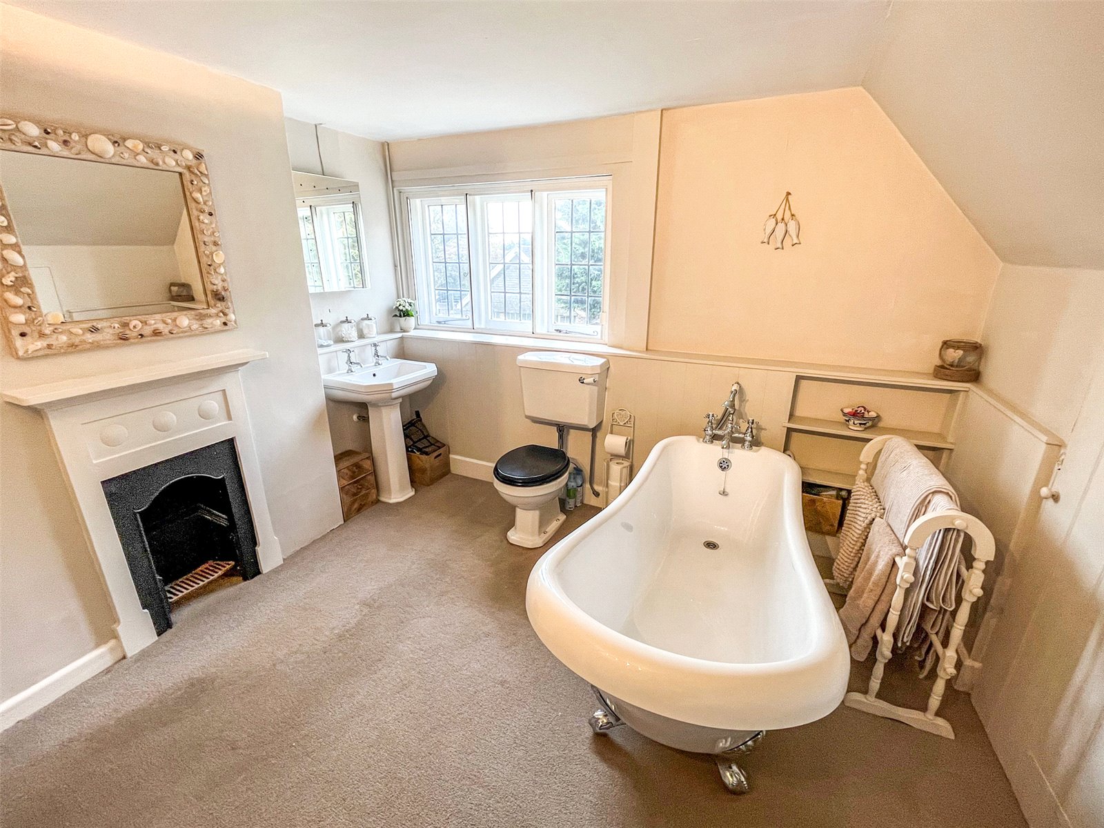 LARGE LUXURY FAMILY BATHROOM: Comprising of an antique styled suite with a rolltop slipper bath on ball and claw feet, with chrome taps and shower attachment, antique style W.C., antique style pedestal wash basin with chrome taps, half panelled wall, character feature fireplace, radiator, window with aspect to front and far-reaching views beyond.