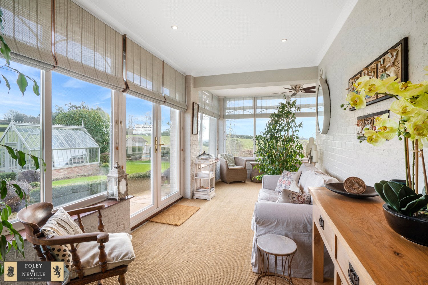 SUNROOM: A particular feature room shaped in an L and which cleverly wraps around the south side of this large residence, having low level brick sides and upper double glazed picture window sections over and enjoying breath taking views of both the large gardens and adjoining countryside, twin ceiling fans, heater and various doors leading off internally to the dining room and sitting room, as well as further double-glazed doors opening to the outside rear sun terraces.