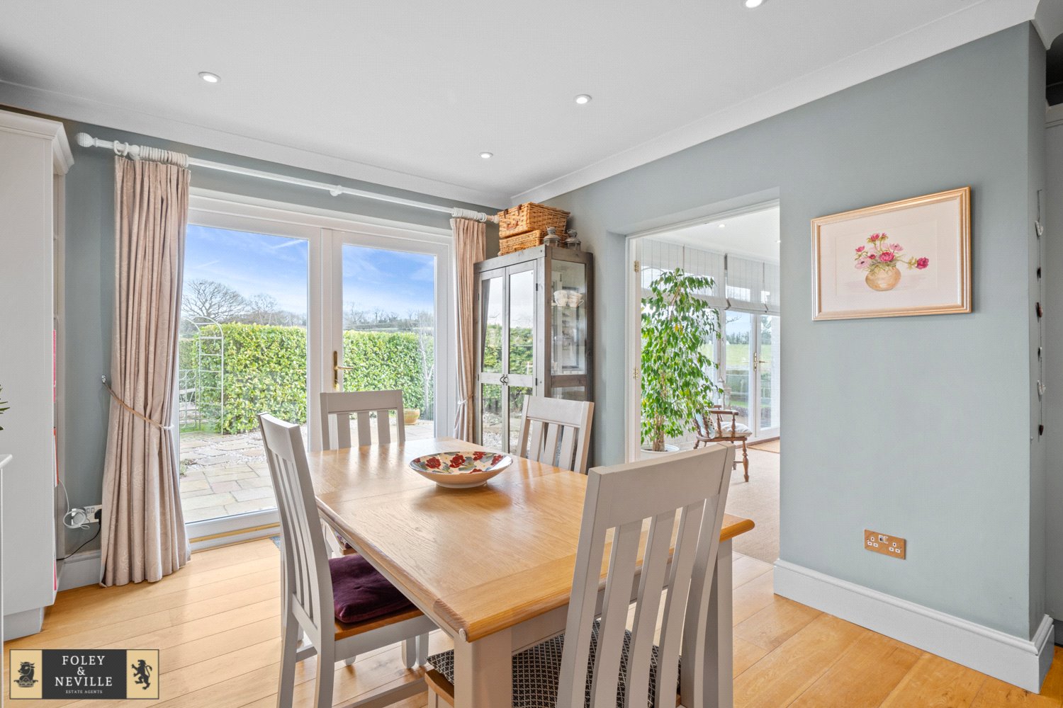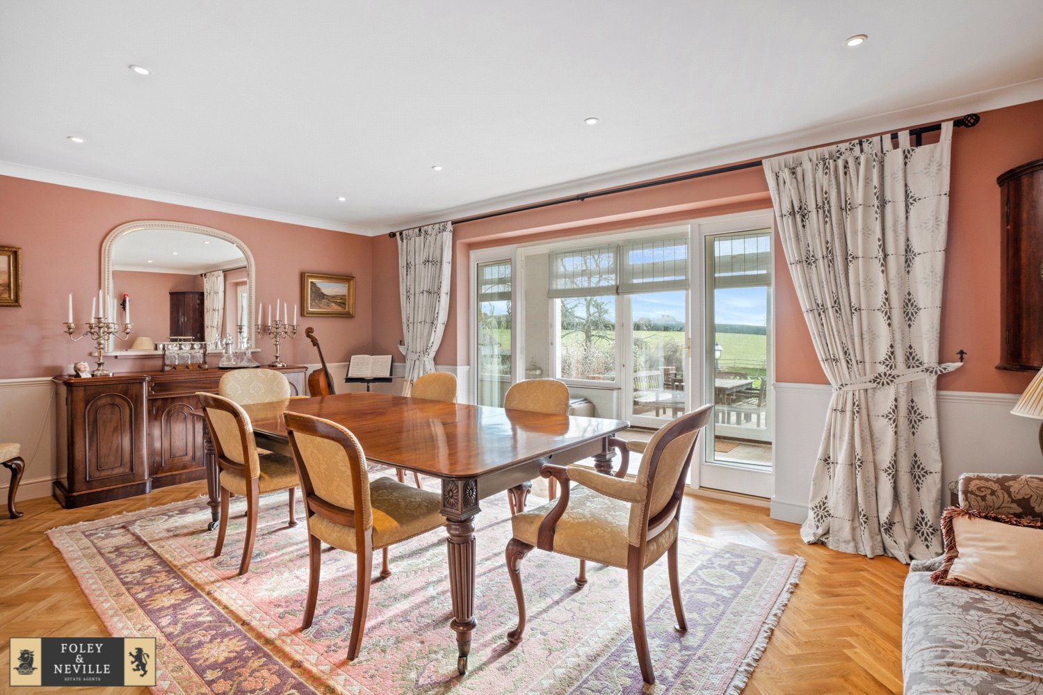 DINING ROOM: Approached by twin glazed and wooden doors from the reception hall, as well as from the adjoining sunroom. Also benefitting from the continuation of attractive oak parquet flooring, dado rails, coved ceiling, radiators, aspect through the double-glazed doors to the sunroom with views beyond of the landscaped gardens and countryside beyond.