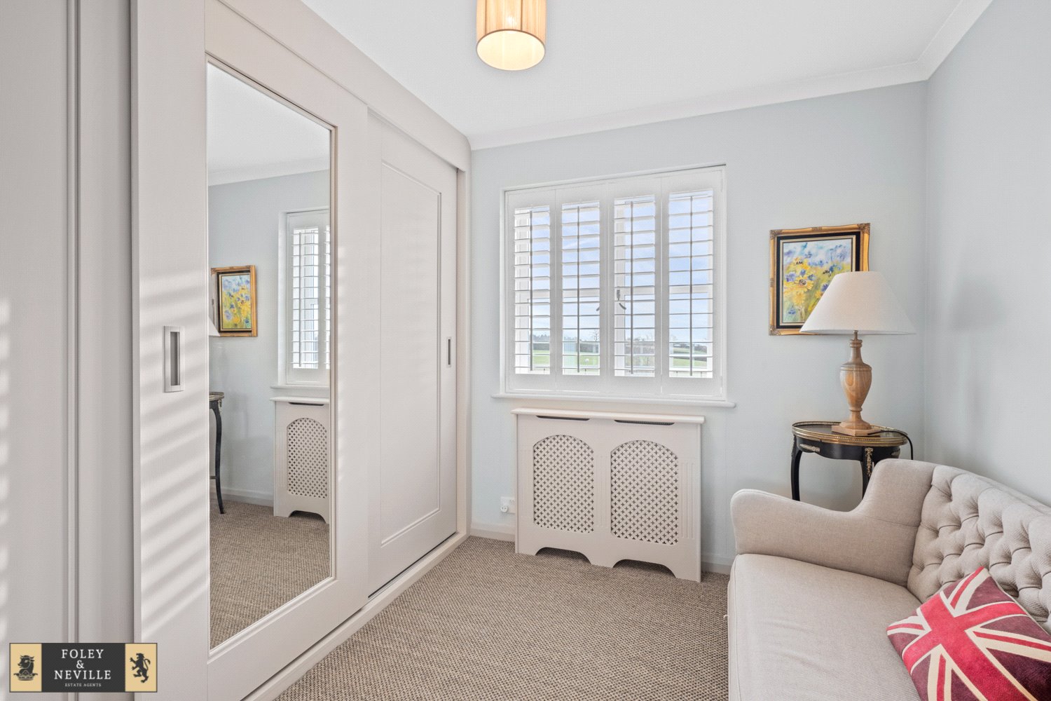 BEDROOM ONE MAIN SUITE: A double sized room with bespoke fitted wardrobe cupboards and further fitted twin drawer cupboards, air conditioning system that can also act as a winter heating system in conjunction with traditional radiators, double glazed door to balcony sun terrace, double glazed windows with incredible views of the adjoining grounds and beyond to the South Downs. Door to luxury ensuite bathroom / shower room.