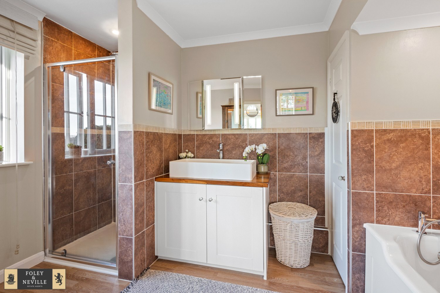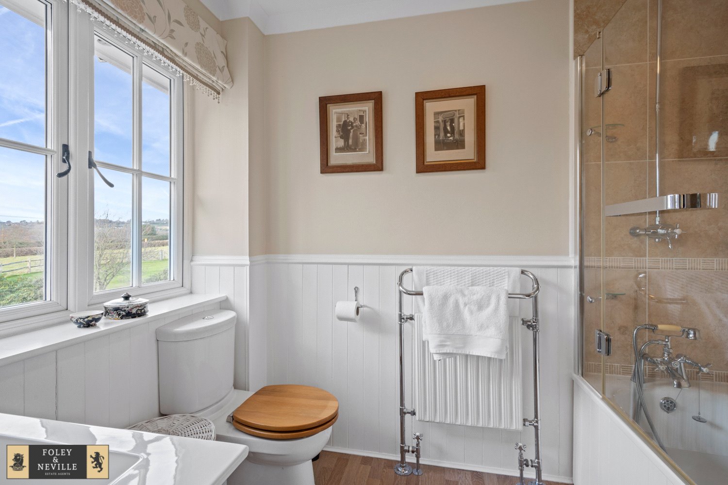 FAMILY BATHROOM / SHOWER ROOM: With cottage styled panelled bath with heavy glazed shower screen and shower system, tiled walls, W.C., circular wash basin with chrome tap, wooden vanity unit under, radiator, double glazed window with views of the countryside. Please note, this room could become an ensuite to bedroom four, as it backs directly onto the room.