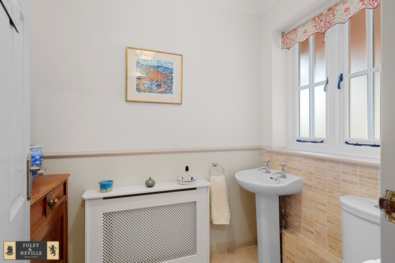 MAIN DOWNSTAIRS CLOAKROOM: With tiled floor, pedestal wash basin, tiled wall, radiator, W.C., double glazed window.