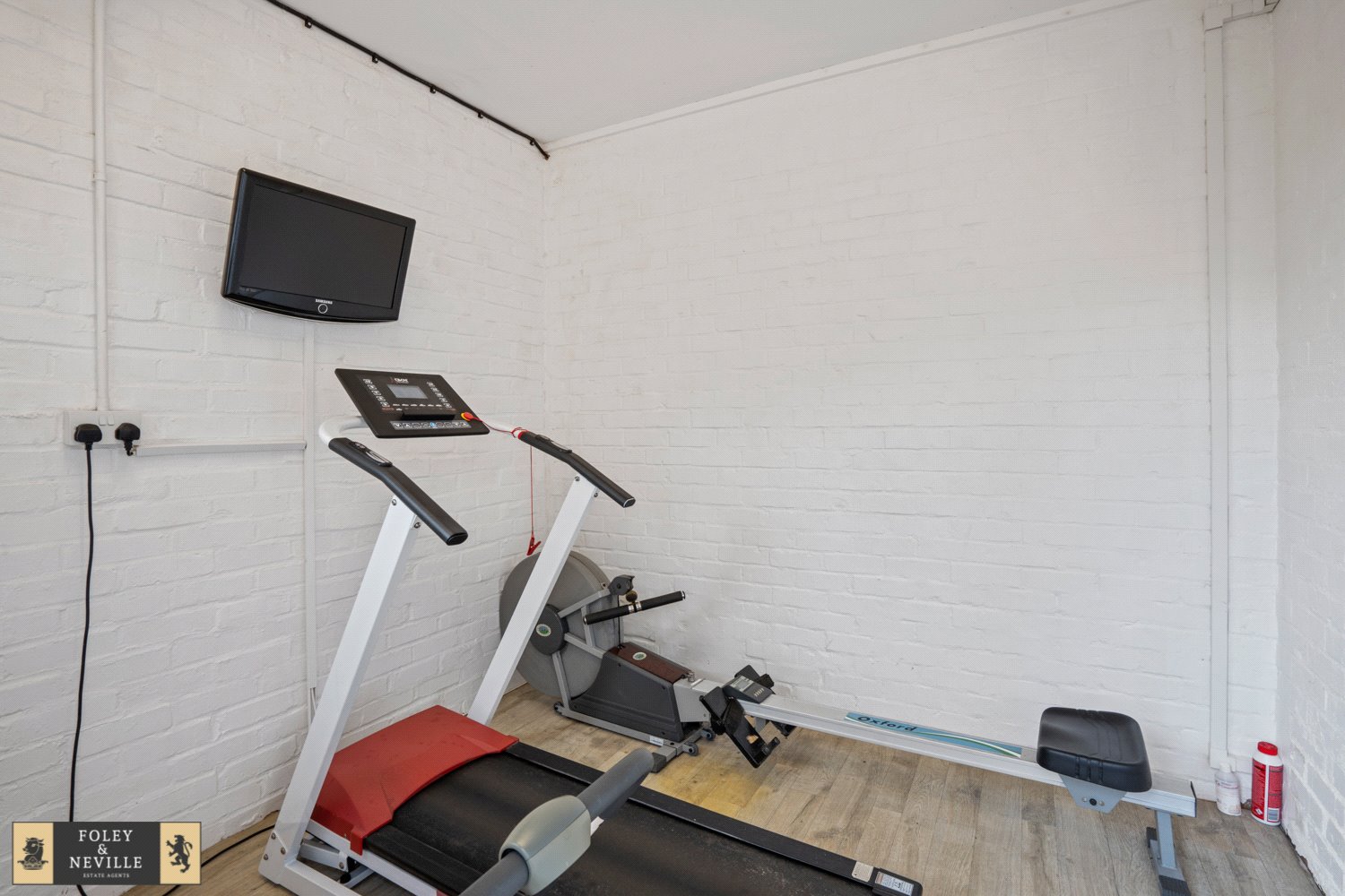 GARAGE: In addition, there is a large detached brick-built building presently incorporating garaging for a number of cars and with an electric car charging unit, and an attached wing of three further compartmentalized rooms. The first room has a recently installed a bespoke spiral wine cellar, the second room is used for housing further freezer appliances and the third is presently being used as a mini gym.