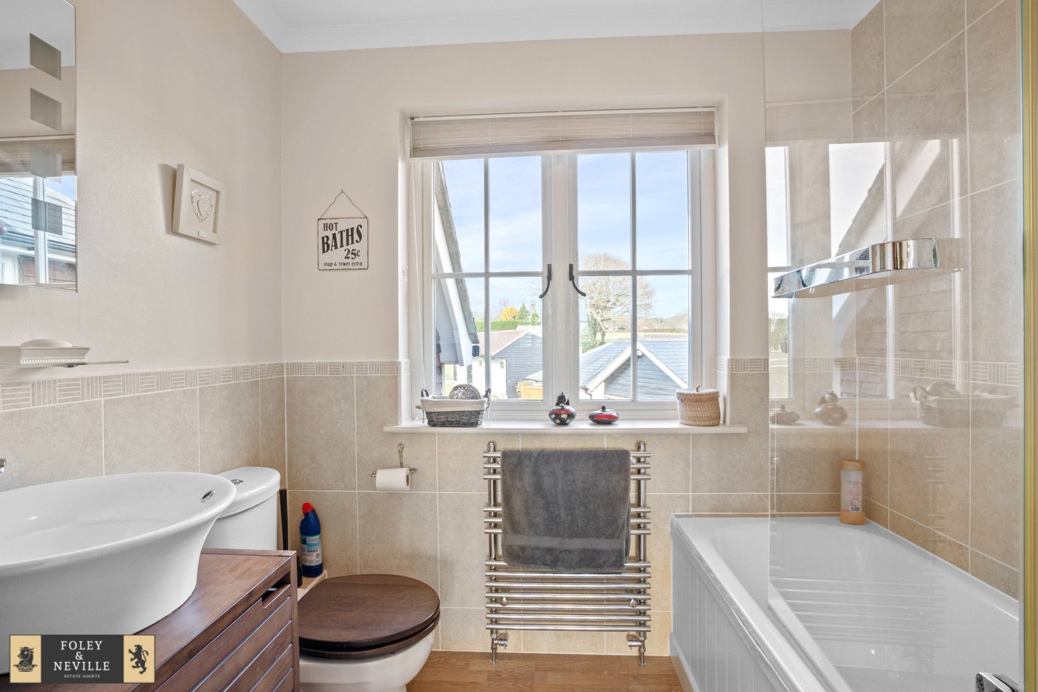ENSUITE BATHROOM / SHOWER ROOM TO BEDROOM TWO: Comprising of oak effect floor, radiator, wash basin with chrome mixer, vanity unit under, W.C., fitted bath with tiled walls and heavy glazed side with shower system, extractor fan, double glazed window with aspect to front and views beyond.
