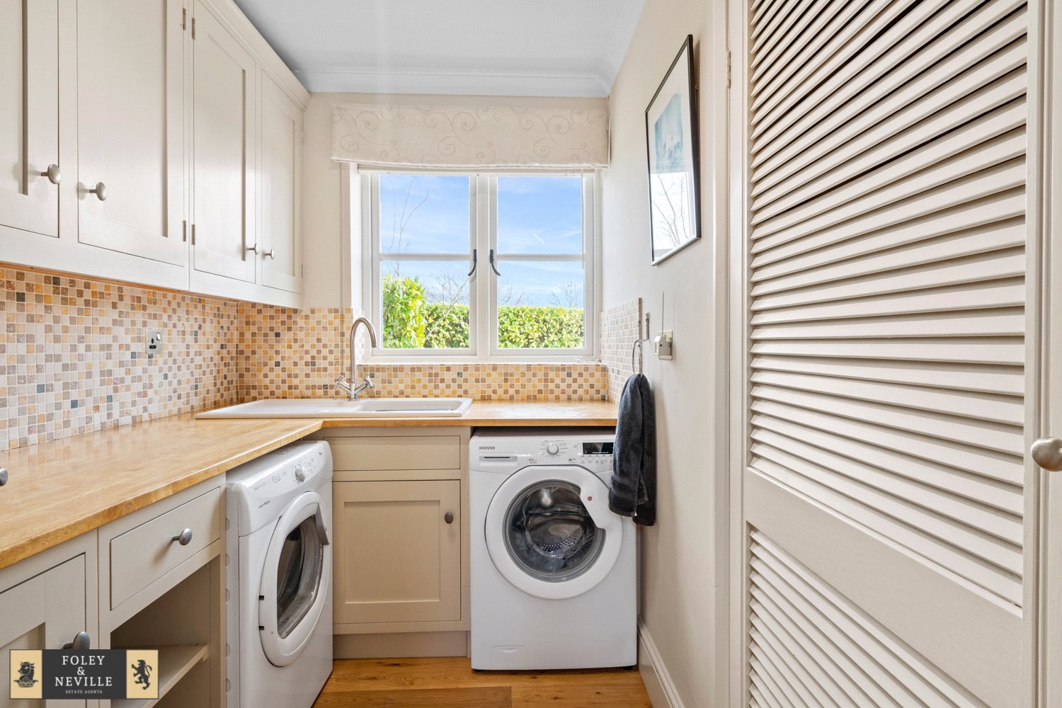 UTILITY ROOM: With bespoke shaker style painted solid wooden cupboard and base units with bamboo wood worktops, space for washing machine, space for dryer, fitted sink unit, double glazed window, walk in airing / laundry room with radiator and cat flap.