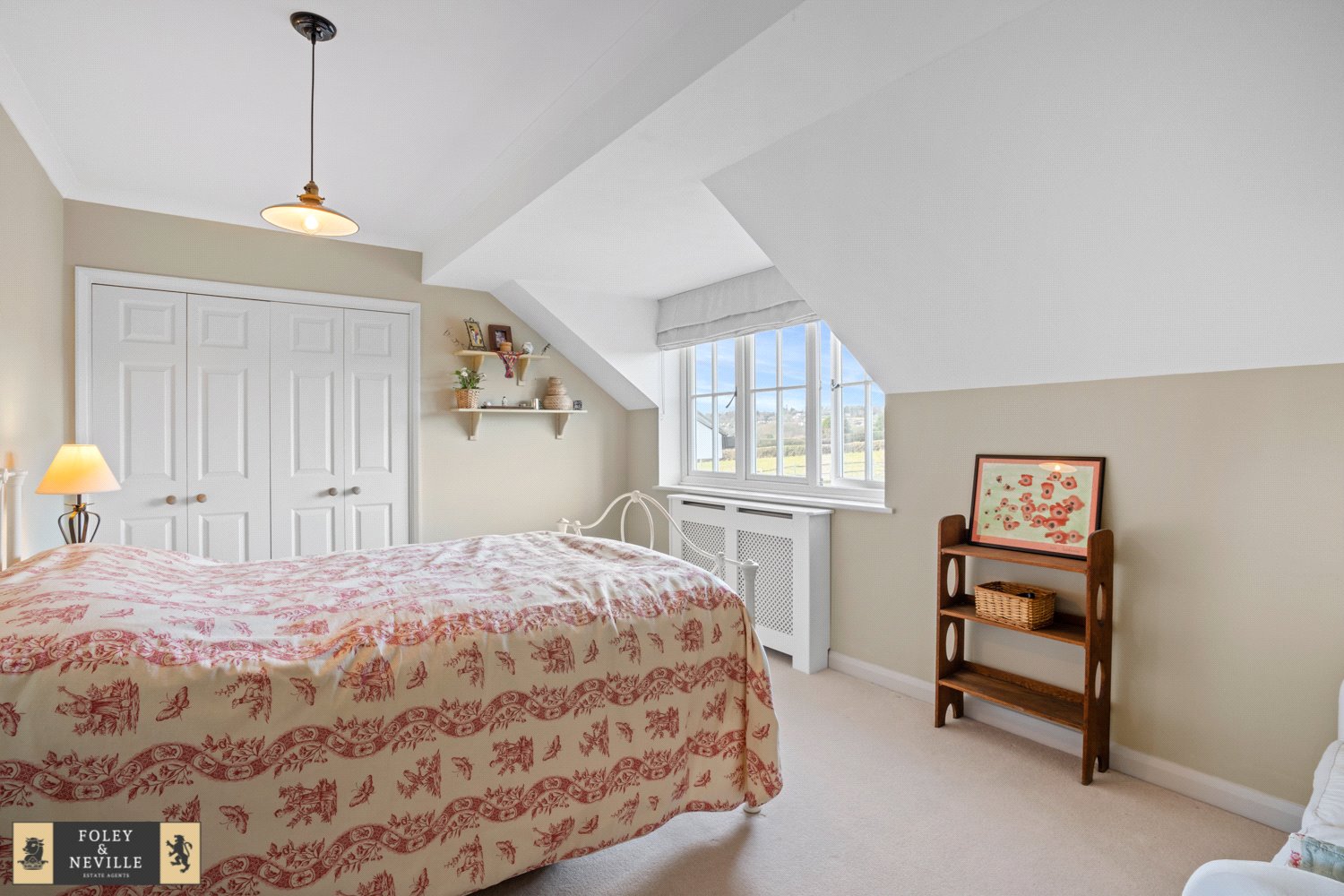 BEDROOM FIVE / STAFF SUITE / GRANNY APARTMENT: With a fitted modern kitchen and being a large sized double room, also with potential to incorporate bedroom six which is currently a dressing room into an ensuite shower room if required, as this backs directly onto the end of this room. Furthermore, there are double glazed windows with views of the grounds and adjoining countryside to the South Downs, as well as double glazed doors leading out onto the exterior south facing balcony enjoying panoramic uninterrupted rural views that are truly quite mesmerizing.