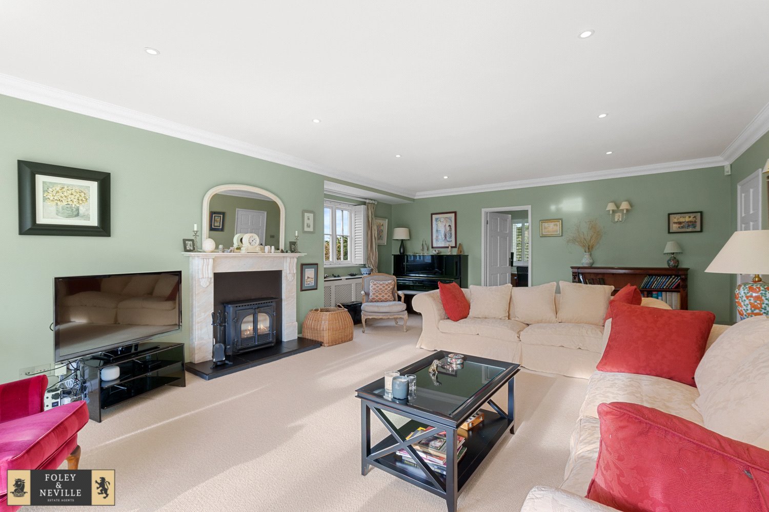 SITTING ROOM: A large triple aspect room with a feature fireplace, fitted with a cast iron wood burner, marble surround, slate hearth, coved ceiling, radiators, double glazed doors leading to the rear sun terrace and enjoying a fabulous aspect over the well-maintained landscaped grounds and beautiful rural views beyond. Further doors leading to the adjoining sunroom and also the downstairs study.