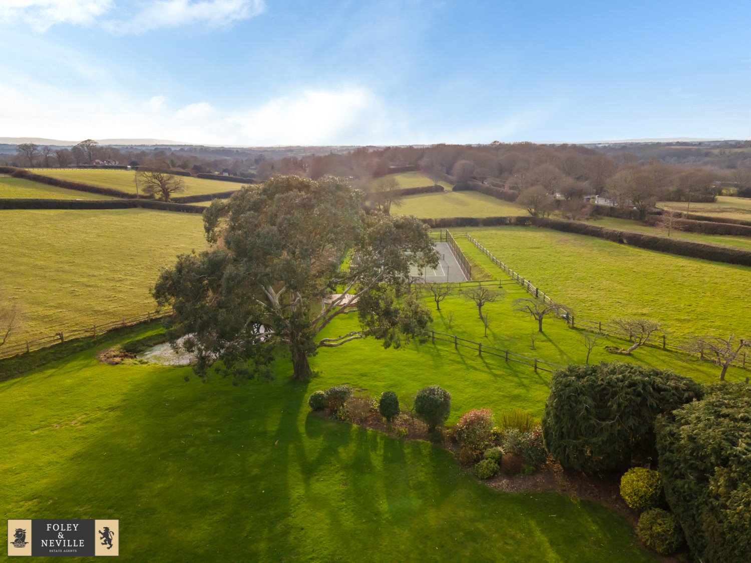 Outside, this fine country home has probably already every most desirable attribute one would hope for, including beautiful easily maintained landscaped gardens, an all-weather tennis court, an outdoor heated swimming pool, its own long private gravelled driveway with electric front gates and automatic night sensor lighting, turning on as one drives to the secluded main residence. In addition, there are numerous outbuildings, three of which are considered suitable for conversion, subject to planning into lucrative holiday letting units and a further brick building (currently a garage block and storerooms) into possibly a large detached annex building. Furthermore, due to the acreage this property possesses, there is also consideration being given for permission to be granted under a predetermination for a large agricultural building.