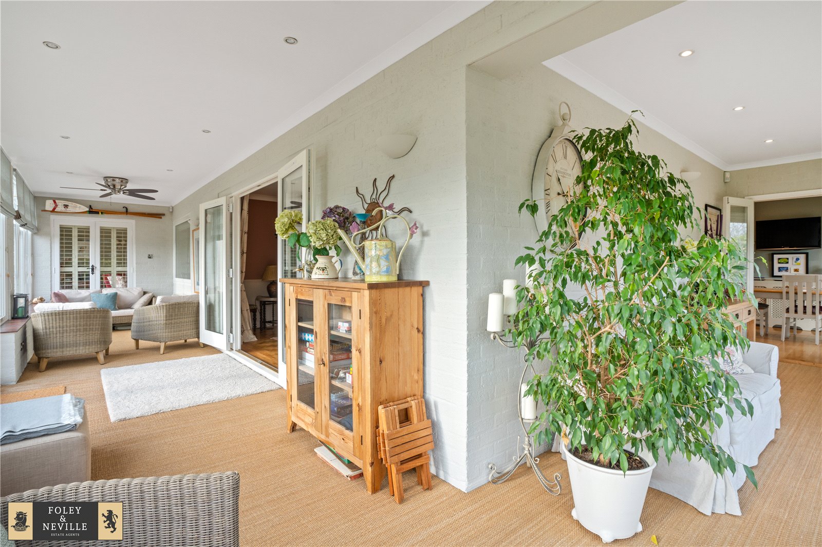 ACCOMMODATION: After entering through a pair of elegant wooden electrically operated driveway gates and proceeding down the long private gravel drive with uniform landscaped sides and night sensor lighting, you arrive to a generous parking and turning area with garaging beyond for a number of cars. To the right of this setting, you are able to approach the main front entrance of this wonderfully located secluded Sussex residence, being greeted by an attractive large heritage style storm porch with tiled base and recessed seating areas. Positioned centrally beyond, is an imposing bespoke panelled front character styled wooden door leading into the property’s main reception hall.