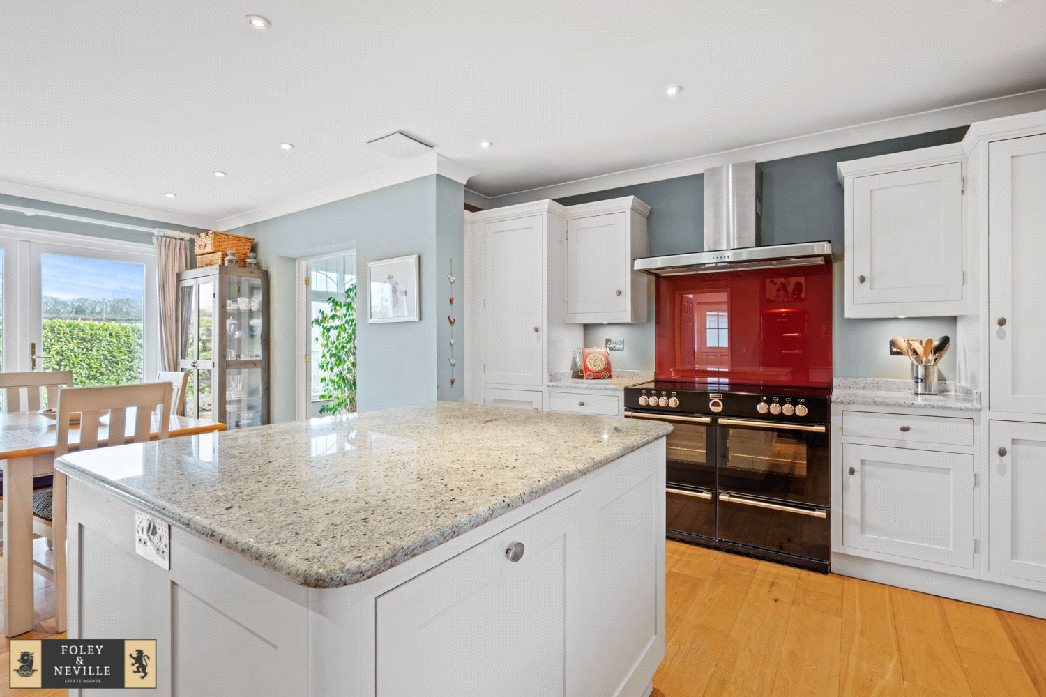 KITCHEN / BREAKFAST ROOM: Which can be approached from the main reception hall, the sunroom and the rear lobby. A generous sized open plan area with an impressive range of bespoke hand crafted painted wooden shaker style cupboard and base units with handsome and substantial Italian granite worksurfaces over. Inset stainless steel sink with mixer taps, integrated Bosch dishwasher, double glazed window with aspect to front, Stoves electric / induction cooking range with ovens, glass back plate, stainless steel air purifier system over, further air extraction system. In addition to the already extensive range of the very attractive bespoke hand-crafted cupboard and base units is a similar styled central island and further preparation area. As the kitchen extends outwards, there is a further breakfast and general day to day dining area, as well as a panelled wooden door accessing a walk-in larder with incorporated wooden and granite shelving. From this section of the kitchen breakfast room are the doorways to the sunroom and rear lobby, as well as double glazed doors leading outside to the side patio.