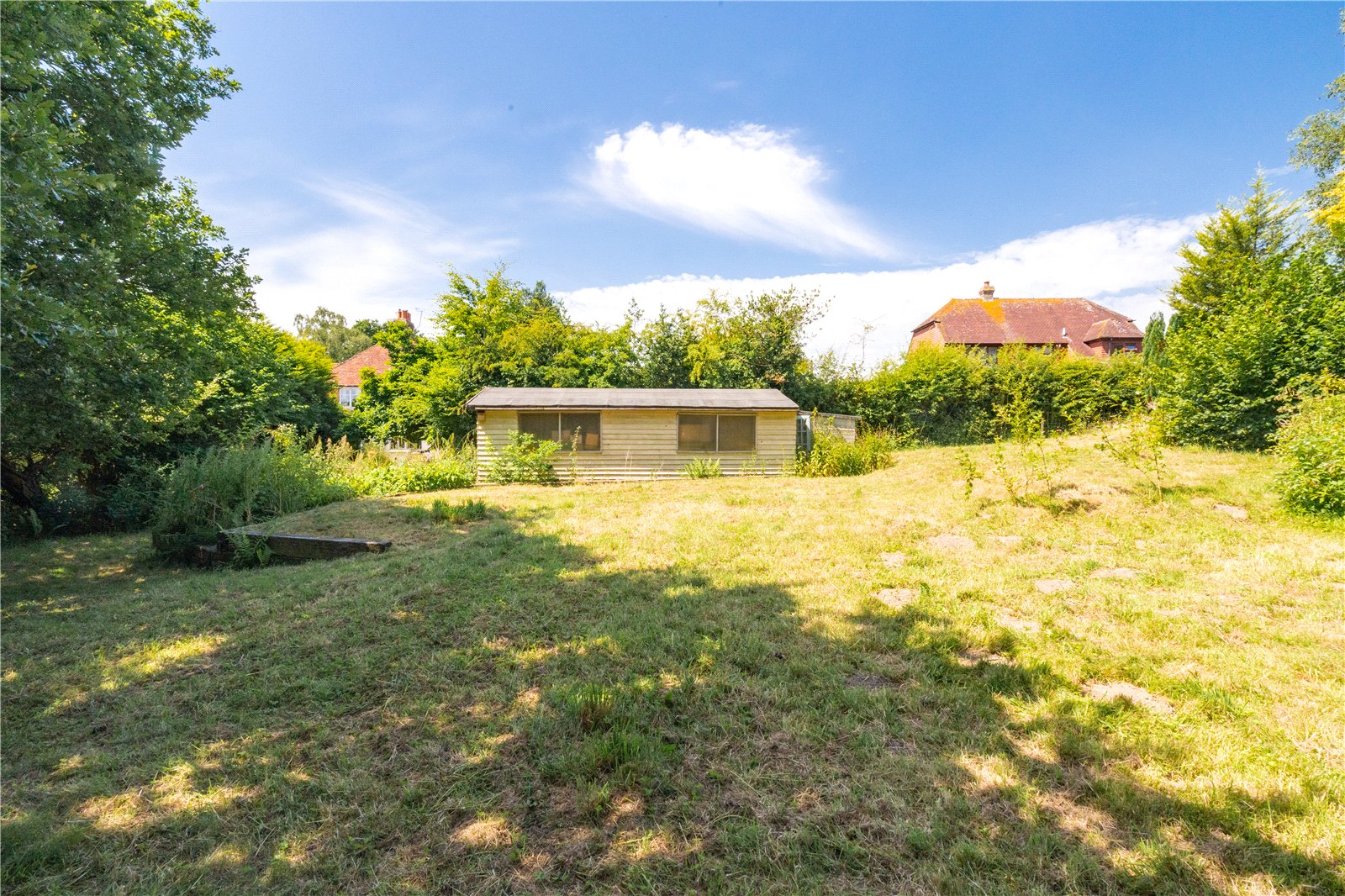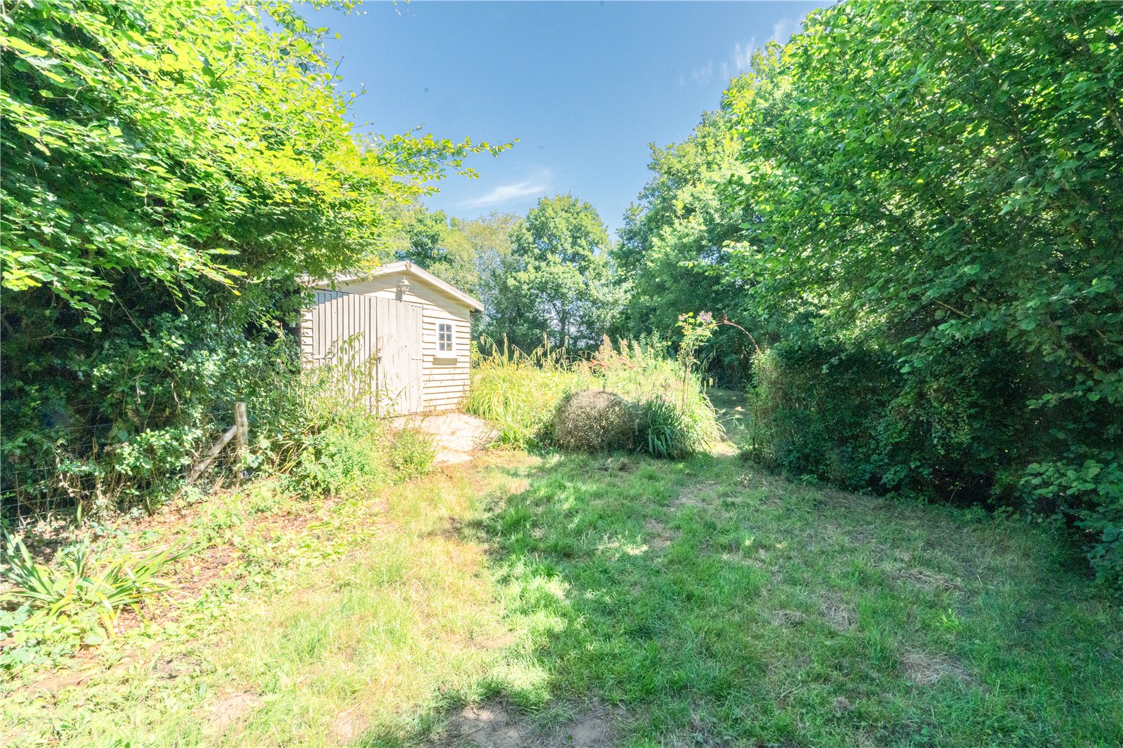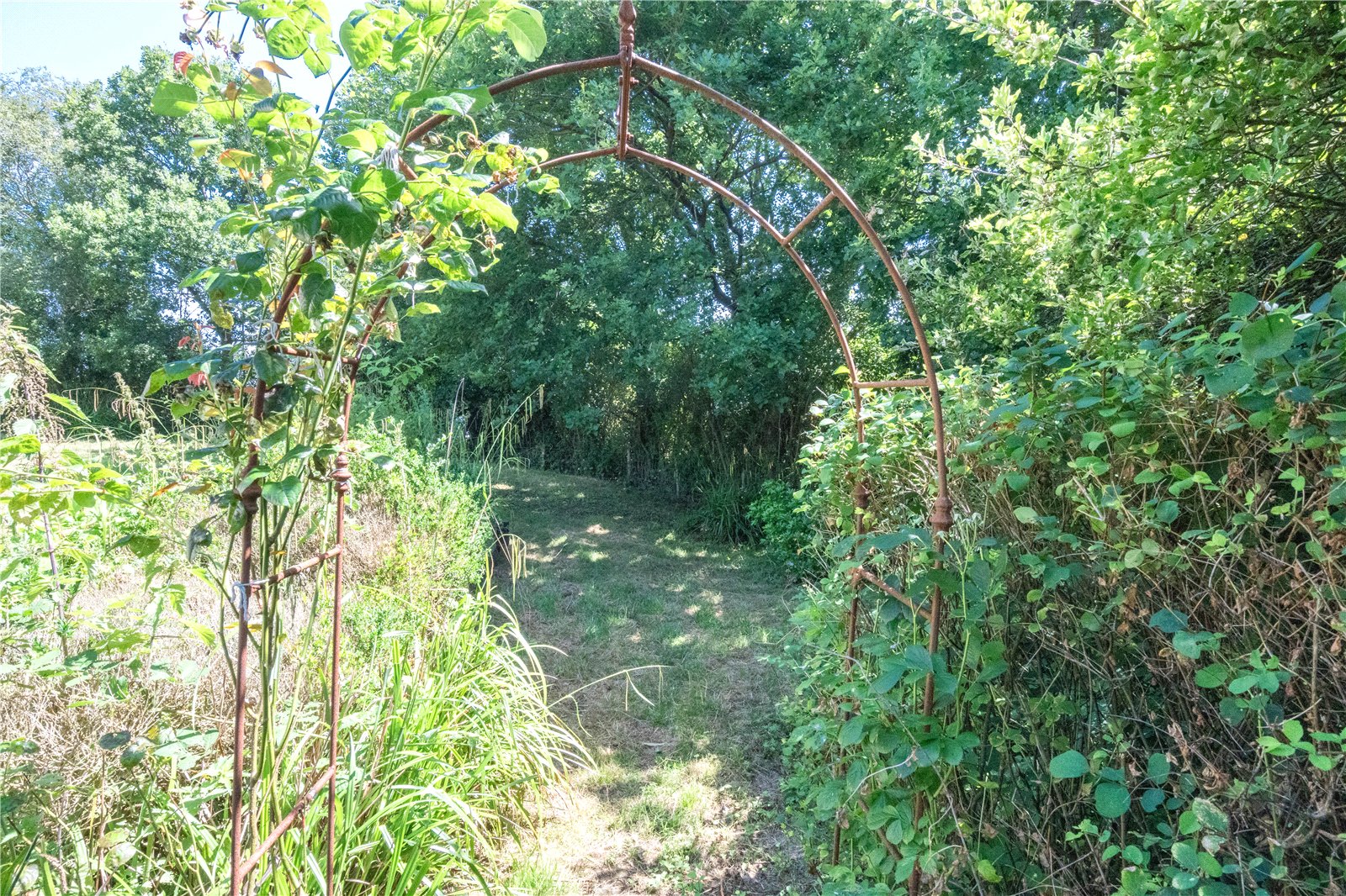 A winding, gently sloping path leads through an enchanting archway and into a large, open glade — a peaceful clearing ideal for children to play, pets to roam, or for creating an expansive kitchen garden. The grounds continue to unfold with areas of lawn, herbaceous borders, and a variety of wildlife-friendly planting that encourages biodiversity. Tucked away at the far end sits a substantial timber outbuilding offering excellent potential for storage, a studio, or even a home office (subject to any necessary consents).
