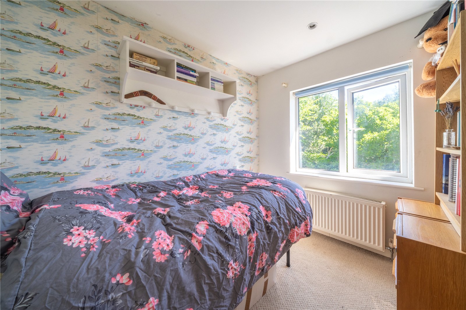 BEDROOM 2: This cheerful single bedroom enjoys a lovely outlook over the surrounding greenery, with a large window allowing in an abundance of natural light. A playful nautical-themed feature wall adds character and charm, making it a particularly appealing space for a child or guest. Neatly arranged with built-in shelving and room for a single bed and storage, it offers a bright and cosy retreat within the home.