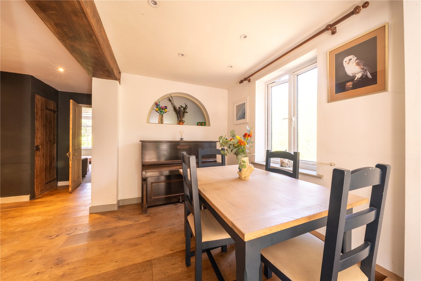 The dining area provides a relaxed yet stylish space to gather, with ample room for a family-sized table and additional furnishings. A charming arched wall recess and upright piano enhance the room’s inviting and eclectic feel, while the layout flows effortlessly into a cosy adjoining snug—ideal for informal entertaining or quiet evenings by the fire. This sociable and practical heart of the home beautifully combines modern convenience with rustic warmth.