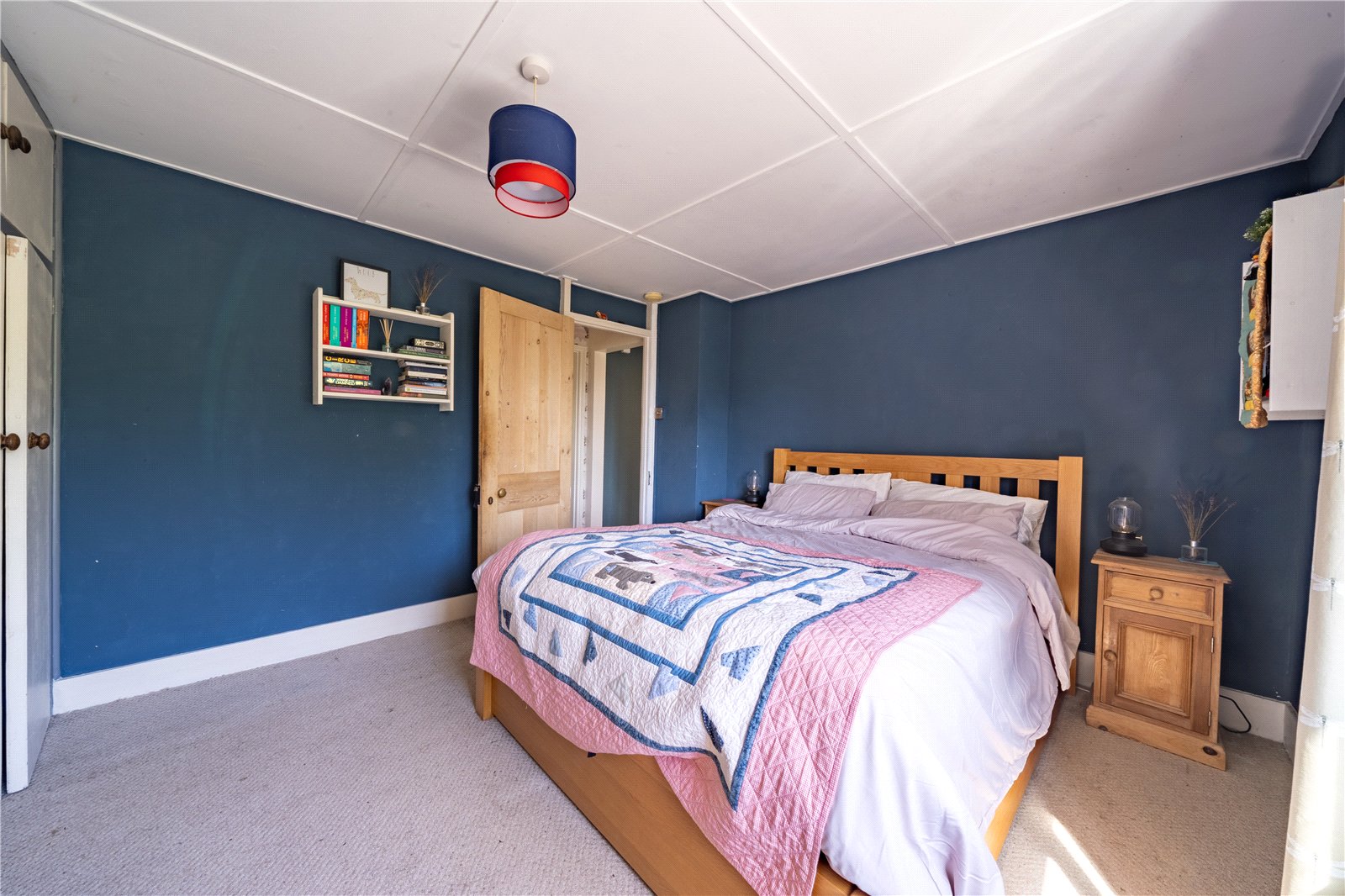 BEDROOM 1: This well-proportioned double bedroom is bright and tranquil, featuring a large window that frames leafy views and welcomes in plenty of natural light. The deep blue walls create a stylish contrast to the neutral carpets and crisp white ceiling, while a charming cast-iron fireplace adds character and period charm. Built-in wardrobes provide useful storage, and there’s ample space for a king-size bed and additional furniture. A peaceful and inviting retreat, ideal as a principal bedroom or comfortable guest accommodation.