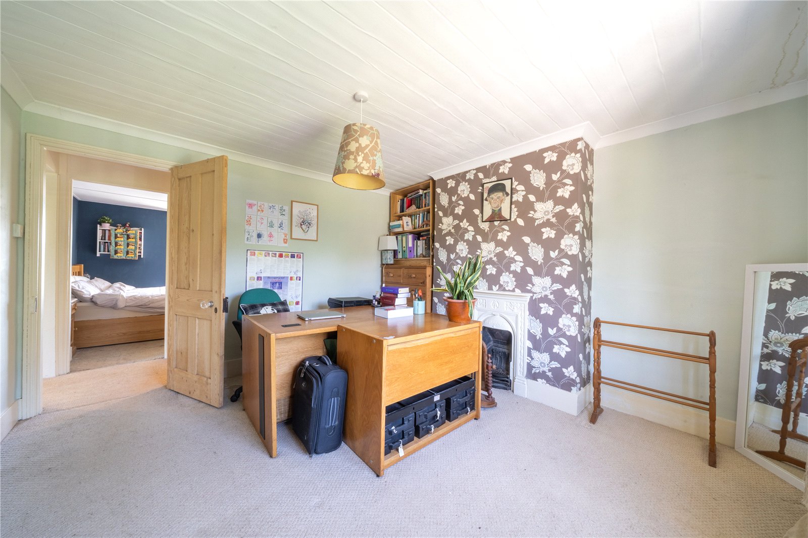 OFFICE/BEDROOM 3: Currently arranged as a home office, this generously sized double bedroom offers excellent versatility and plenty of natural light, thanks to a wide window overlooking the garden. A charming feature wall with floral wallpaper and a decorative fireplace lends character, while the built-in wardrobes provide ample storage. Soft pastel tones, a white painted ceiling, and neutral carpeting enhance the room’s sense of calm and space, making it equally well-suited as a peaceful workspace, guest room, or additional bedroom.