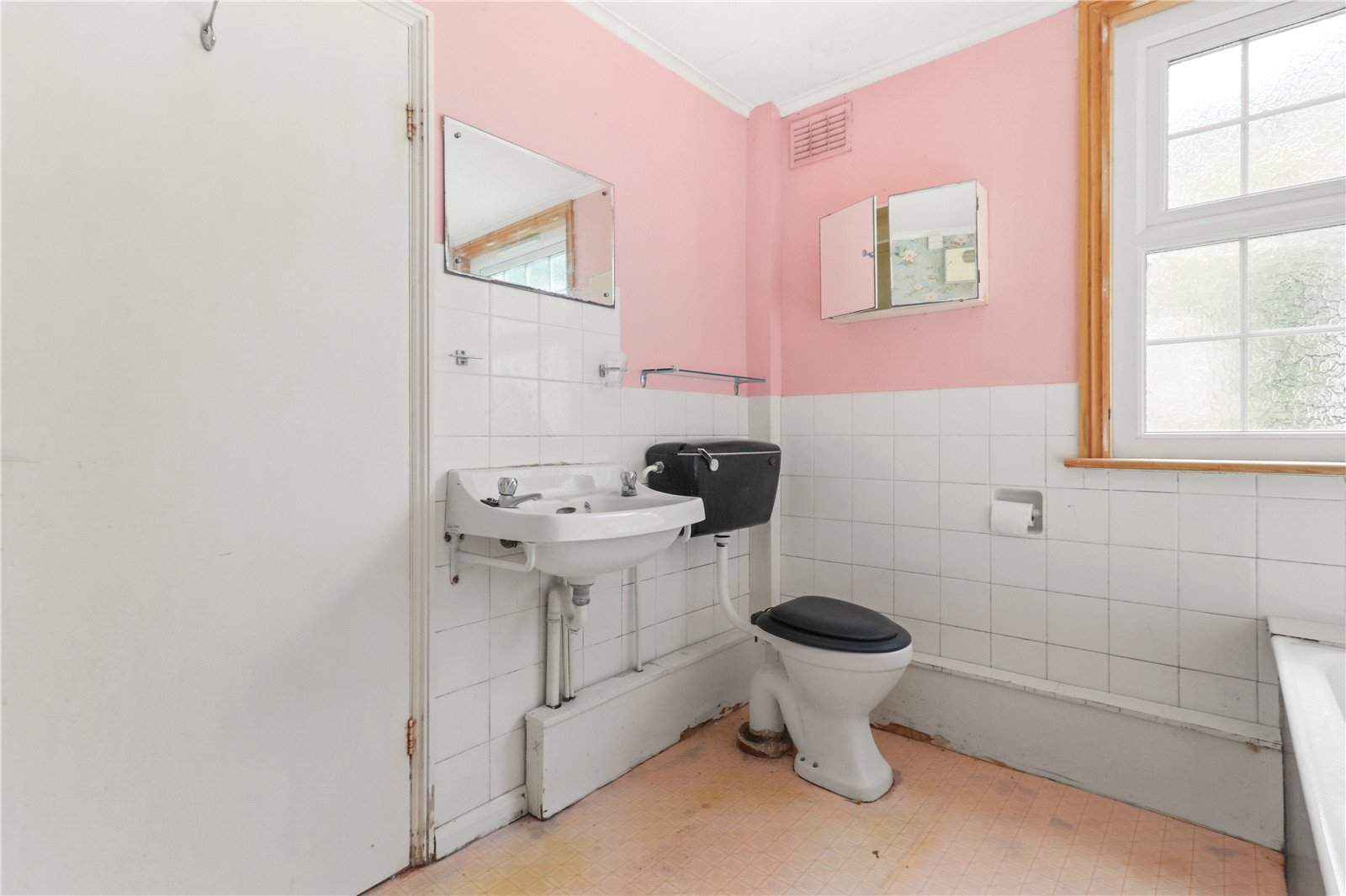 DOWNSTAIRS BATHROOM: With panelled bath, W.C., wash basin with tiled splash back, double glazed window.