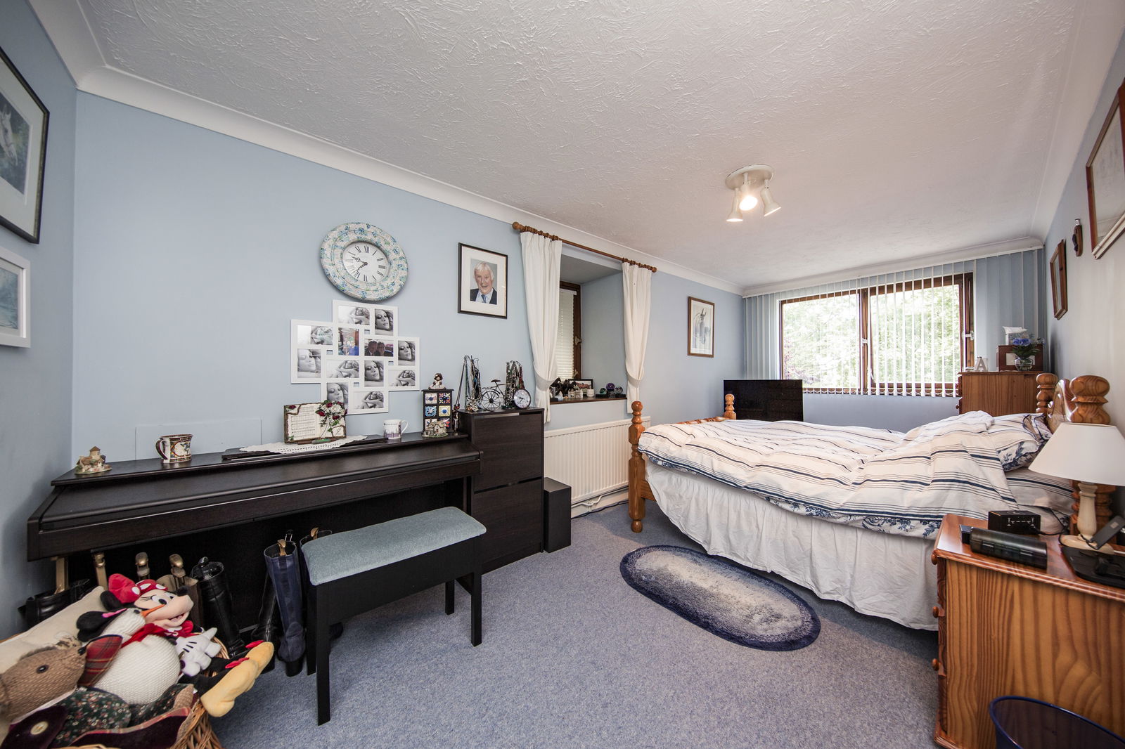 MASTER BEDROOM: Dual aspect room with double glazed windows to both sides. Range of fitted bedroom furniture incorporating wardrobe cupboards and over bed storage. Further double fitted wardrobe cupboard with light within. Vanity dresser with drawers. Radiator. Timber panelled door to: