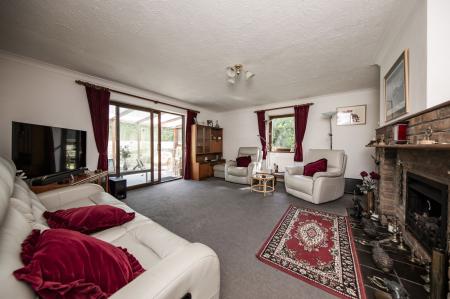 SITTING ROOM: Triple aspect room with double glazed windows to sides and sliding double glazed patio doors to conservatory. Attractive brick built fireplace with inset gas fire, timber mantle and display shelf. Radiators.