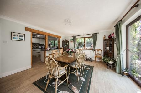 DINING ROOM: A dual aspect room with double glazed windows to side and double glazed sliding patio door to front garden. Timber effect vinyl flooring. A breakfast bar extends from the kitchen through the opening. Radiator.