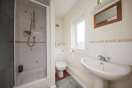 EN-SUITE SHOWER ROOM: Double glazed window. Shower cubicle. WC with concealed cistern. Pedestal wash basin with tiled splash back. Extractor fan.