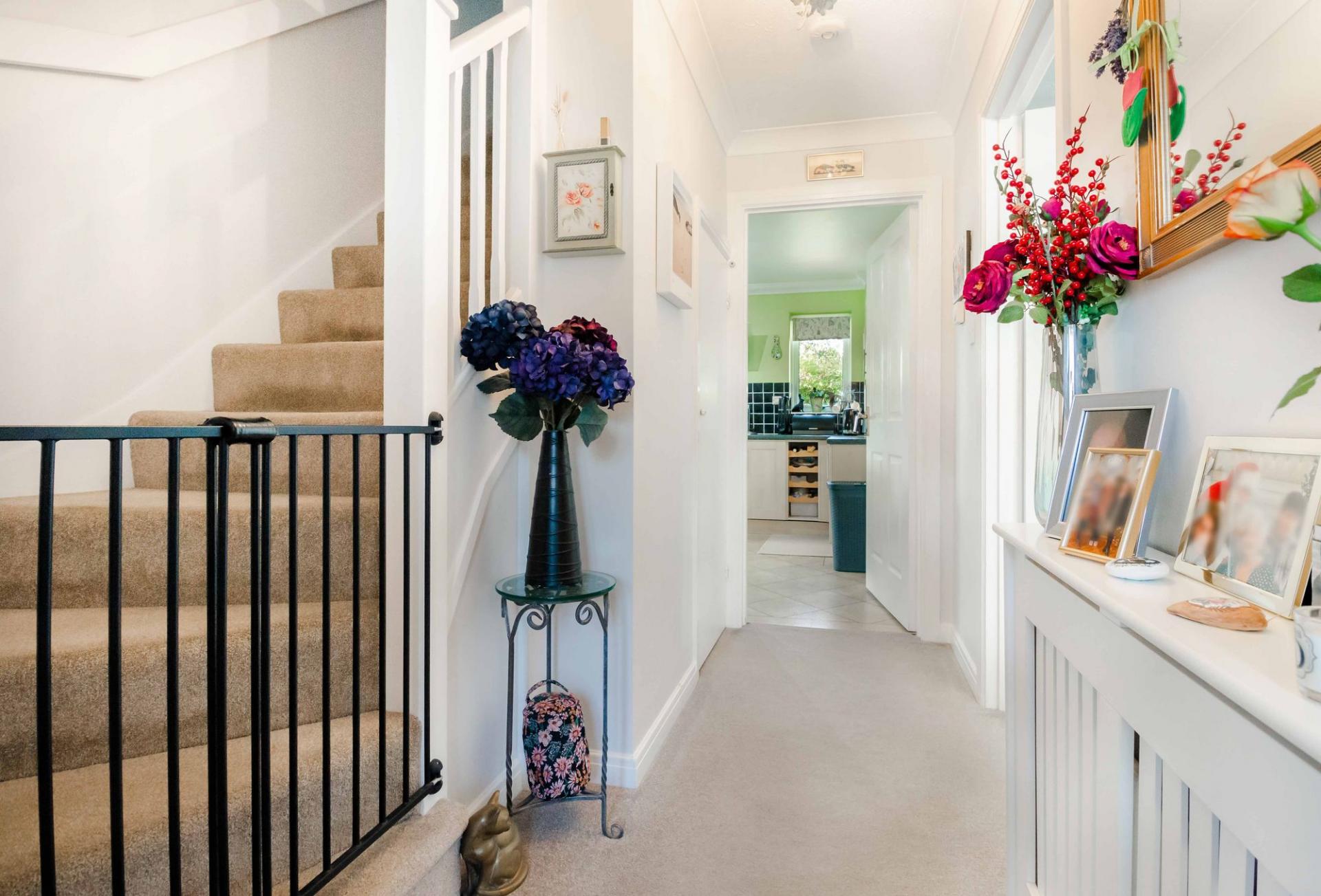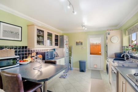 The ground floor is entered via the hallway with the downstairs cloakroom adjacent and a useful under-stairs storage cupboard. There is a spacious sitting room with a large bay window and a gas fireplace, a generous kitchen with a range of matching units to eye and base level and a breakfast bar peninsula, a separate dining room with access via double doors into the sitting room, creating an excellent space for entertaining. Sliding doors lead onto a well-sized private rear garden. The property also benefits from Trooli superfast broadband installed.