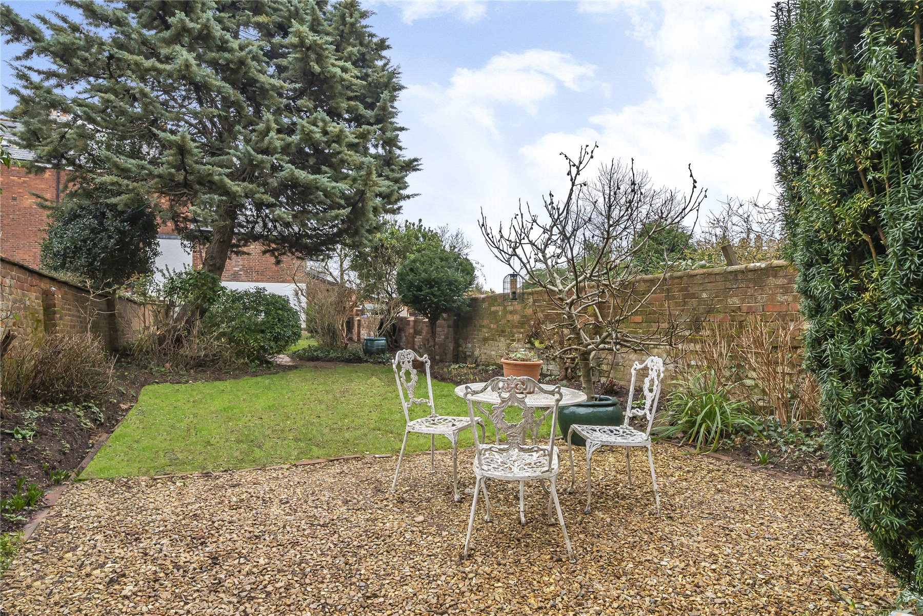 The rear garden is a lovely feature. Approximately 85ft in length with stone chipped seating area flowing into an expanse of lawn with walled boundaries and planted borders.