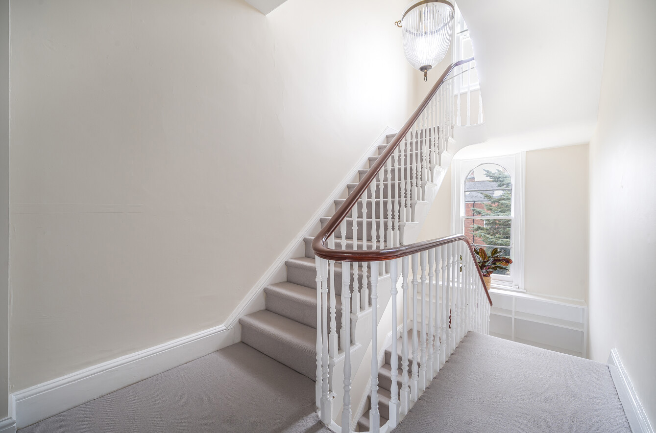 The beautiful staircase with exposed balustrades turns to the first floor, with a window overlooking the rear garden on the half landing and display/storage shelving. Double doors open to the shelved linen cupboard with water tank.