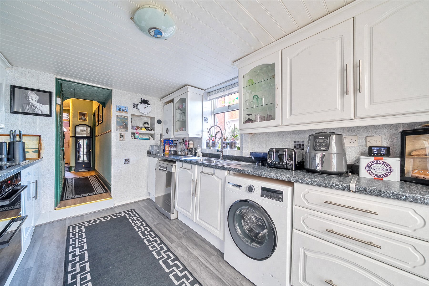 The modern kitchen is well proportioned and finished to a high standard, with a comprehensive range of high-gloss white base and wall units, including glass-fronted cabinets, attractive work surfaces and tiled splashbacks. Integrated appliances include an induction hob with double oven below and a stainless-steel and glass extractor hood, with space and plumbing for a washing machine and dishwasher. A side window and door lead into the conservatory, which provides a pleasant additional living space with a modern radiator and double doors opening onto the courtyard, ideal for relaxing or entertaining.