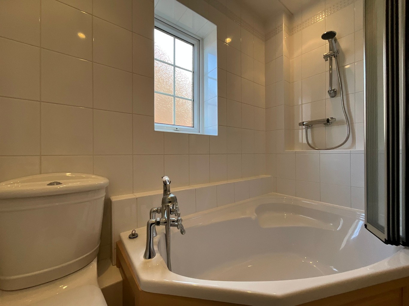 Bathroom (2.16 x 1.85)Features: UPVC double glazed window, panelled bath, low level WC, pedestal hand wash basin, heated towel rail, overhead shower.