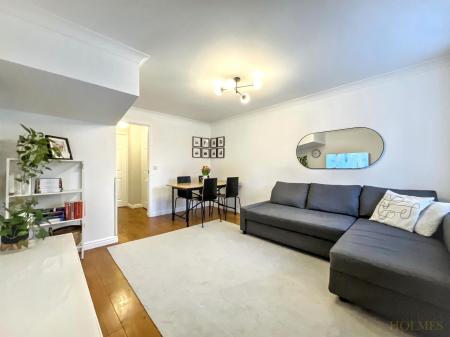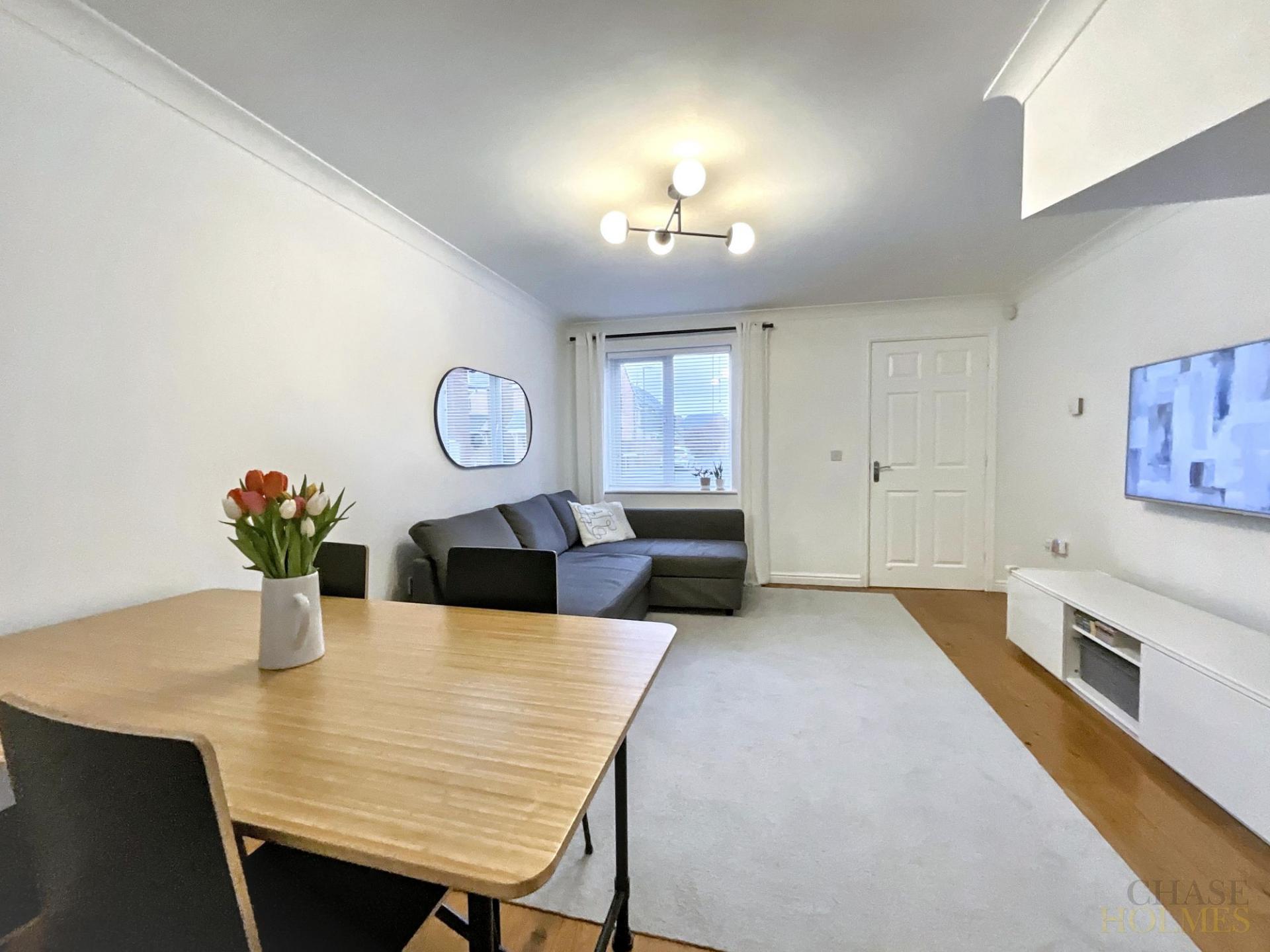 Upon entering, you are greeted by a generously proportioned lounge, filled with natural light and boasting neutral decor that enhances the sense of space and versatility, complemented by stylish engineered wood flooring that adds warmth and a contemporary finish.