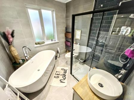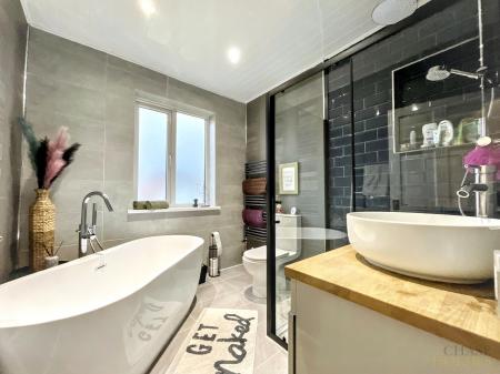 Upstairs, the property boasts three well-proportioned bedrooms, each thoughtfully designed to maximise space and comfort. The luxurious family bathroom is appointed with a freestanding bath and a walk-in shower, offering a spa-like experience within your own home.