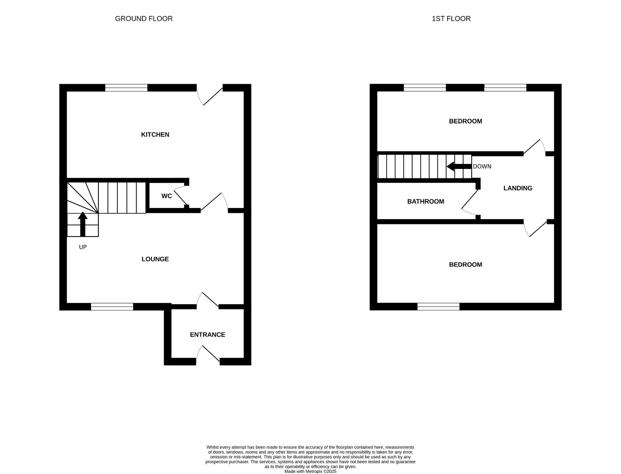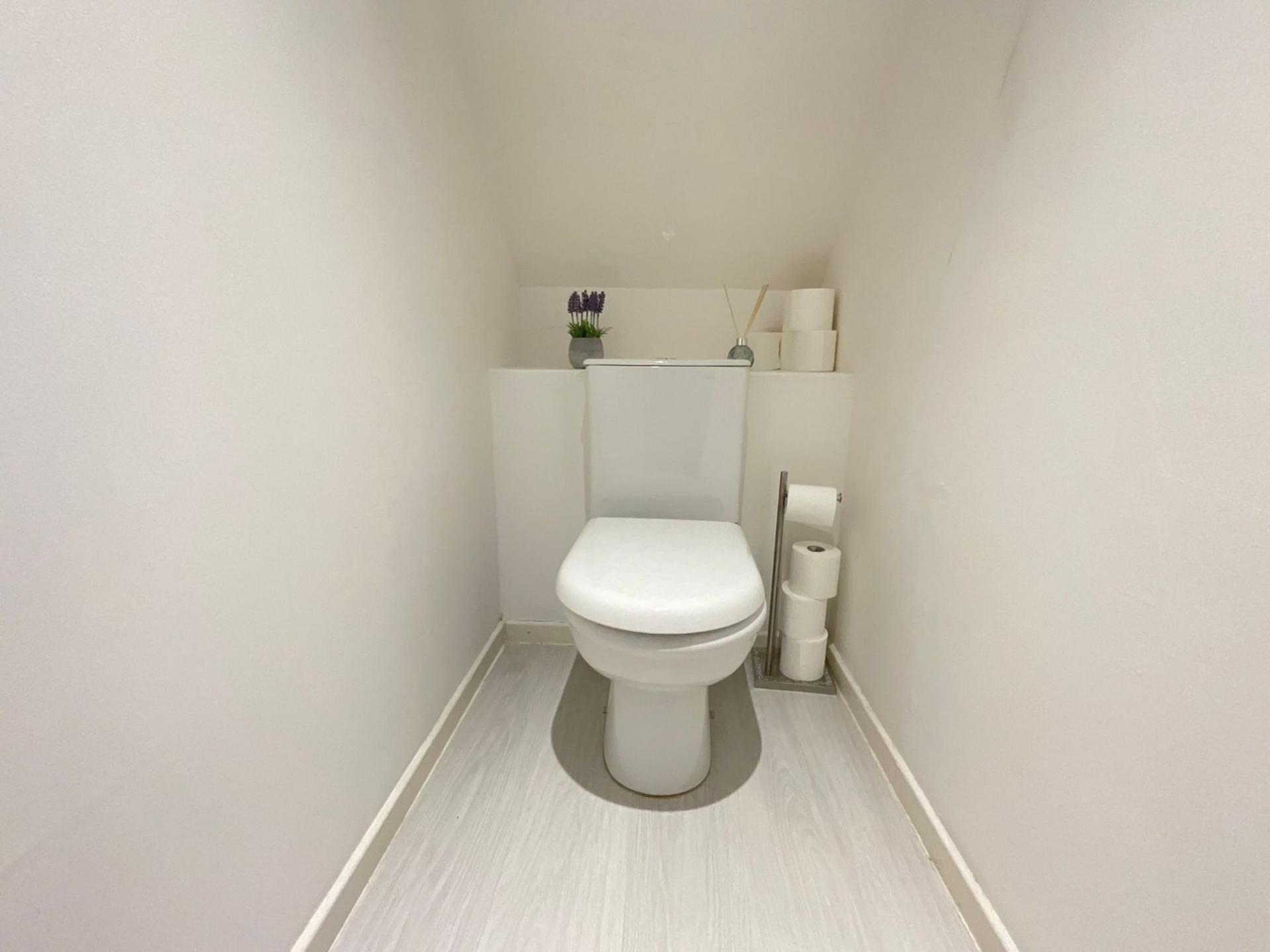 Upstairs, the home comprises two generously sized bedrooms, both of which benefit from large windows that enhance the feeling of space and light. The master bedroom offers ample room for a double bed and additional furniture, while the second bedroom is versatile and could be used as a guest room, nursery, or home office. The family bathroom completes the first floor, featuring a clean and functional design with all the essentials needed for modern living.
