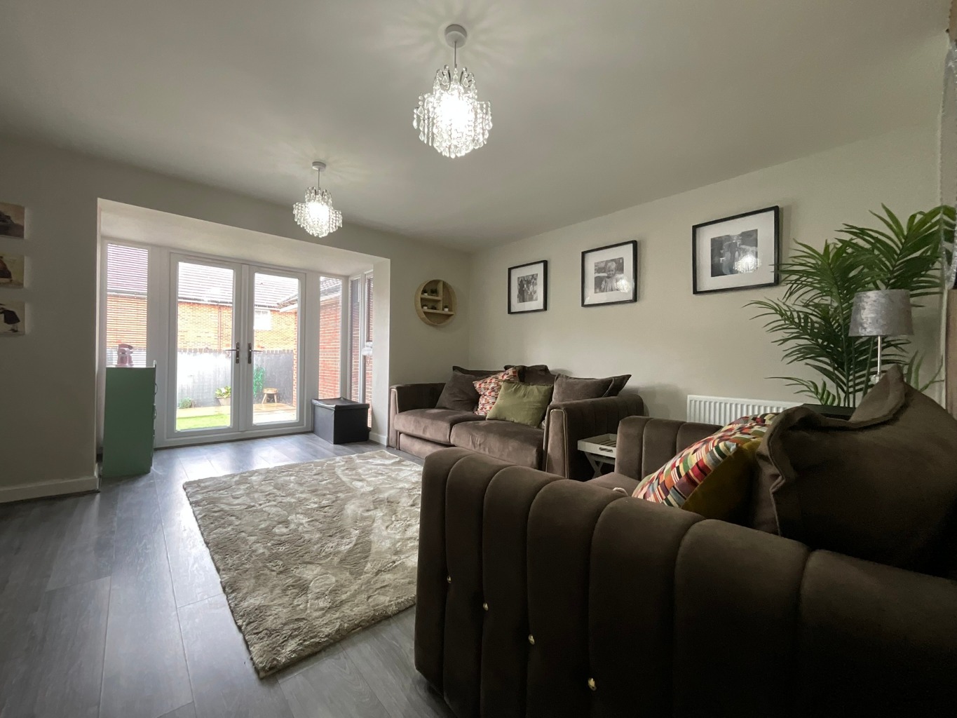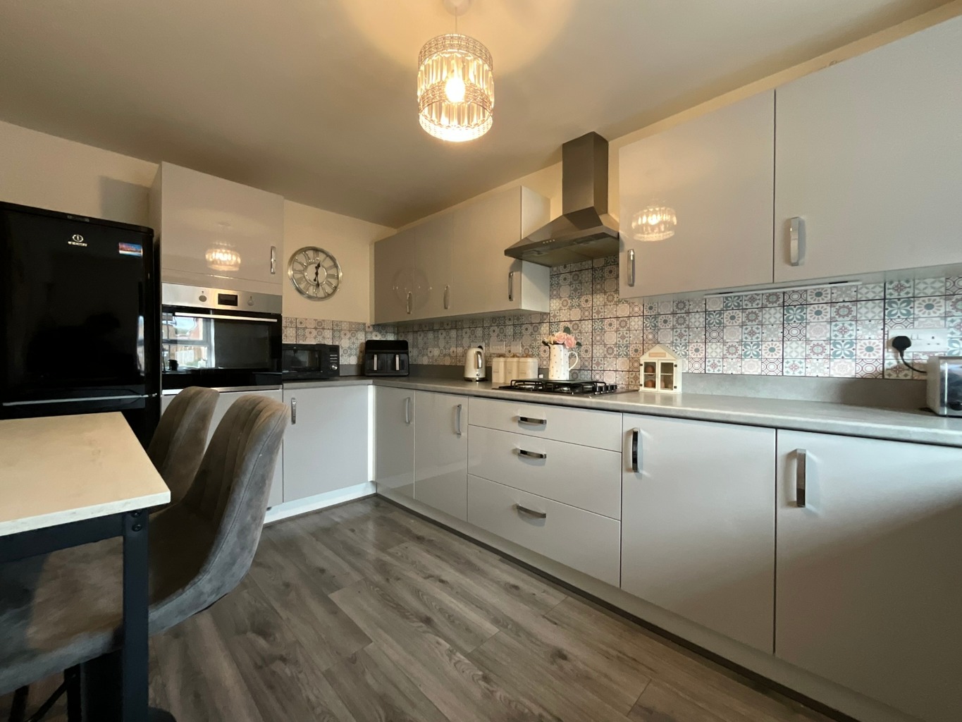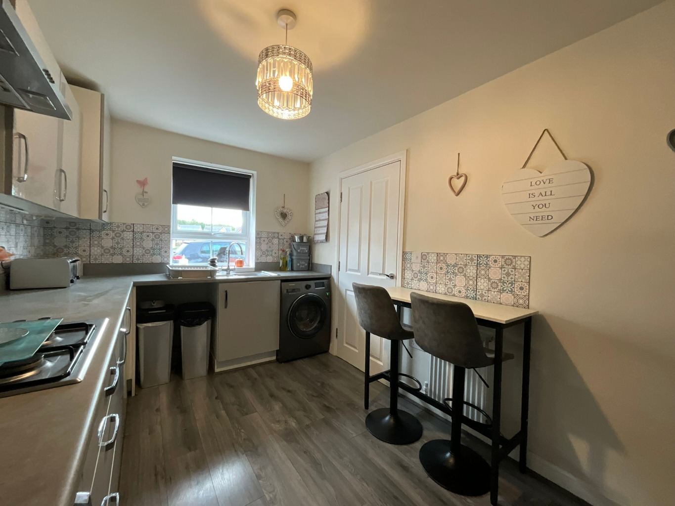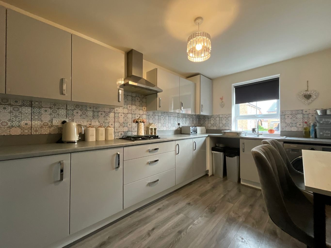 The home welcomes you with attractive kerb appeal, a driveway, and a secure garage, providing excellent parking and storage. Inside, a bright and spacious reception room creates a warm and inviting atmosphere, ideal for relaxing or entertaining. The modern kitchen is well designed for family life, offering ample workspace and storage.