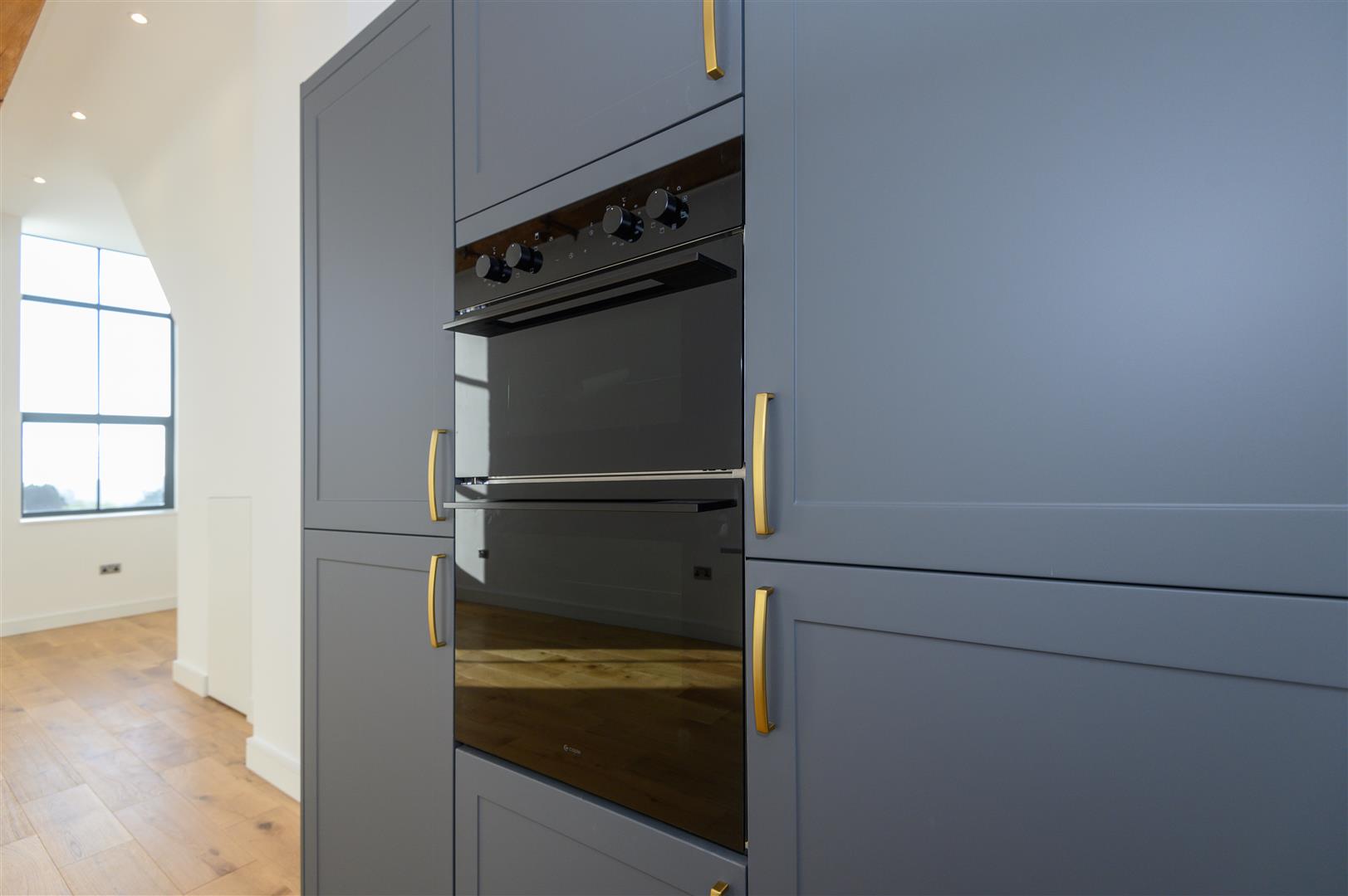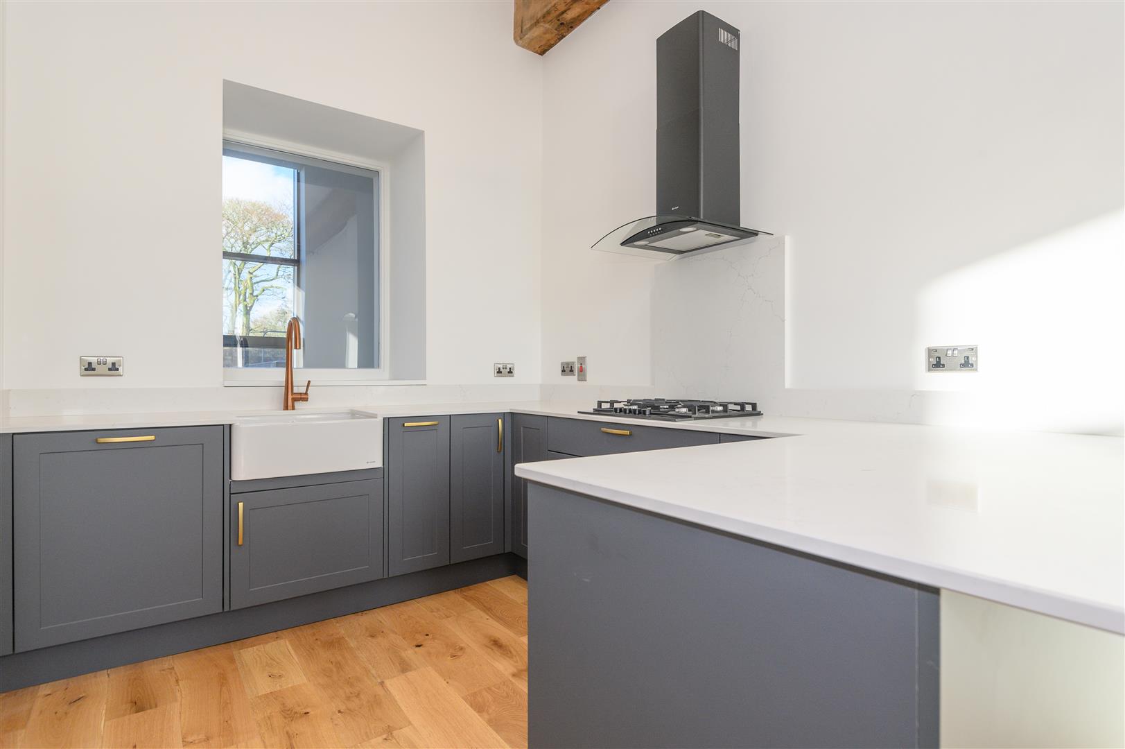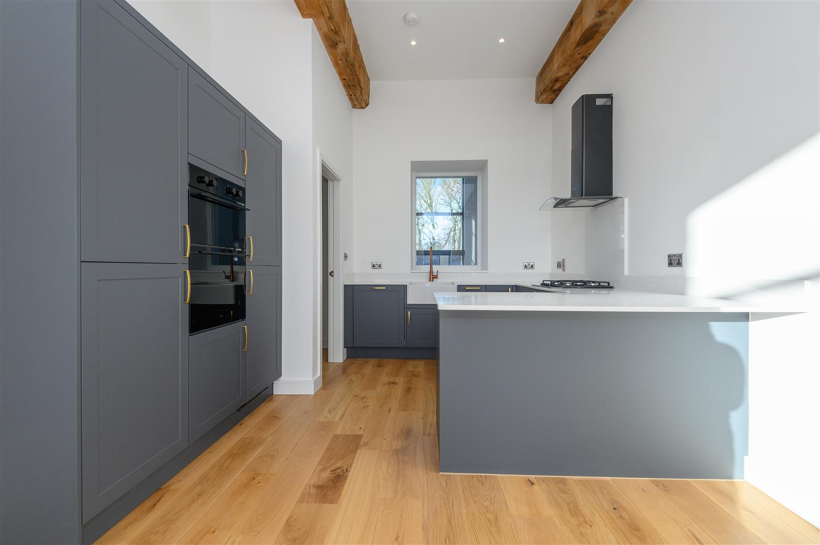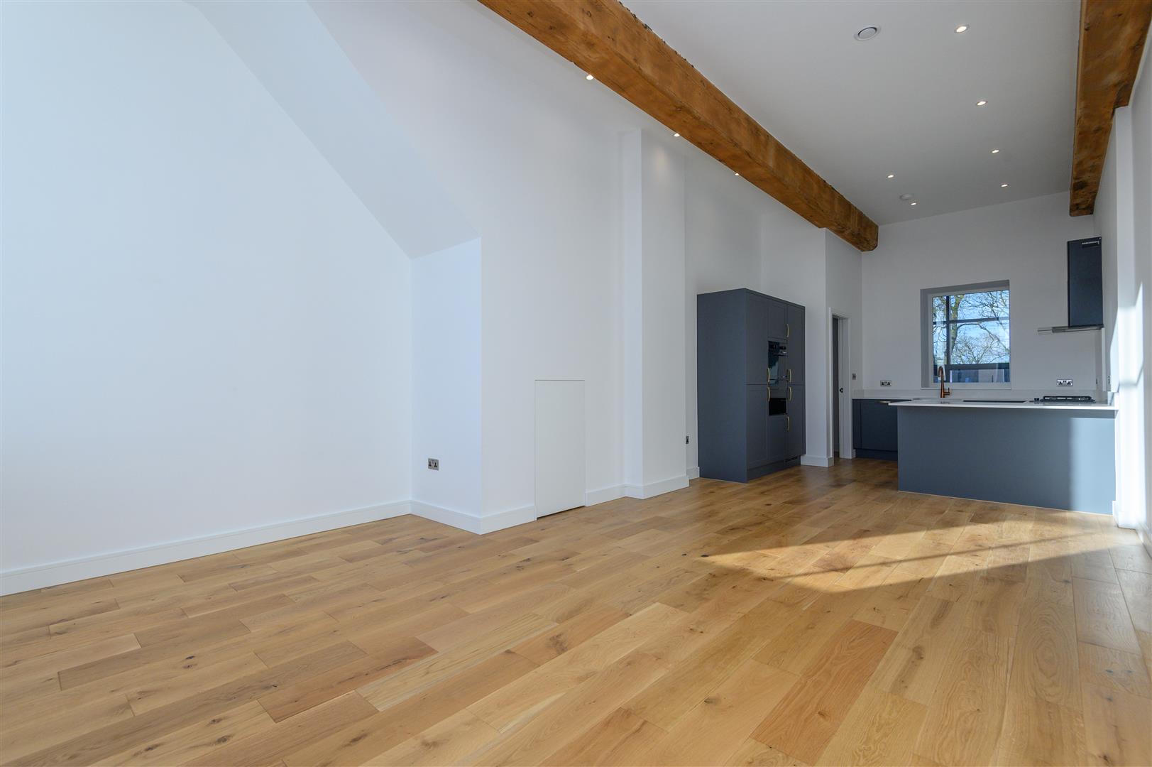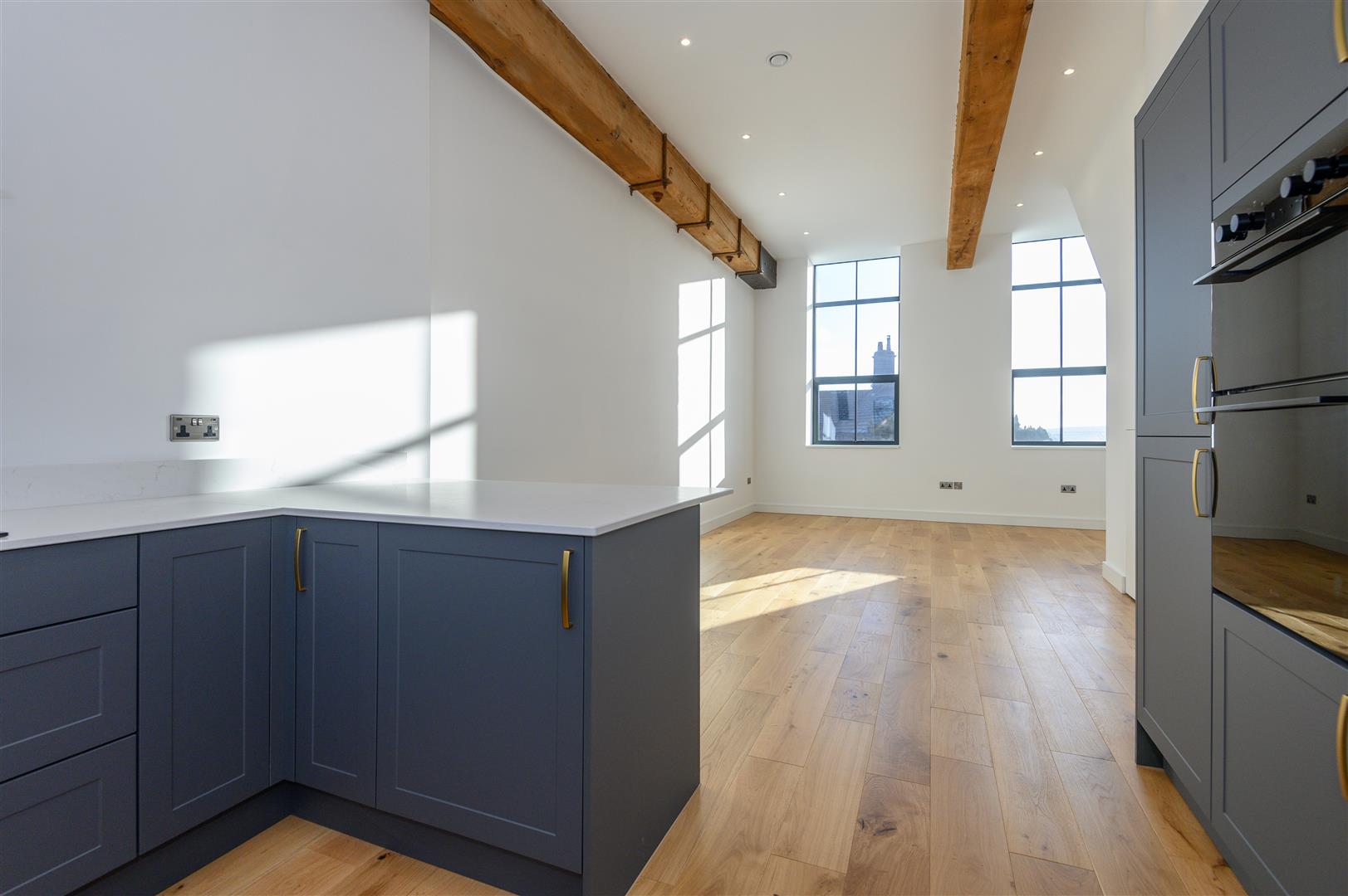 - Open-plan living kitchen with exposed beams and mill windows