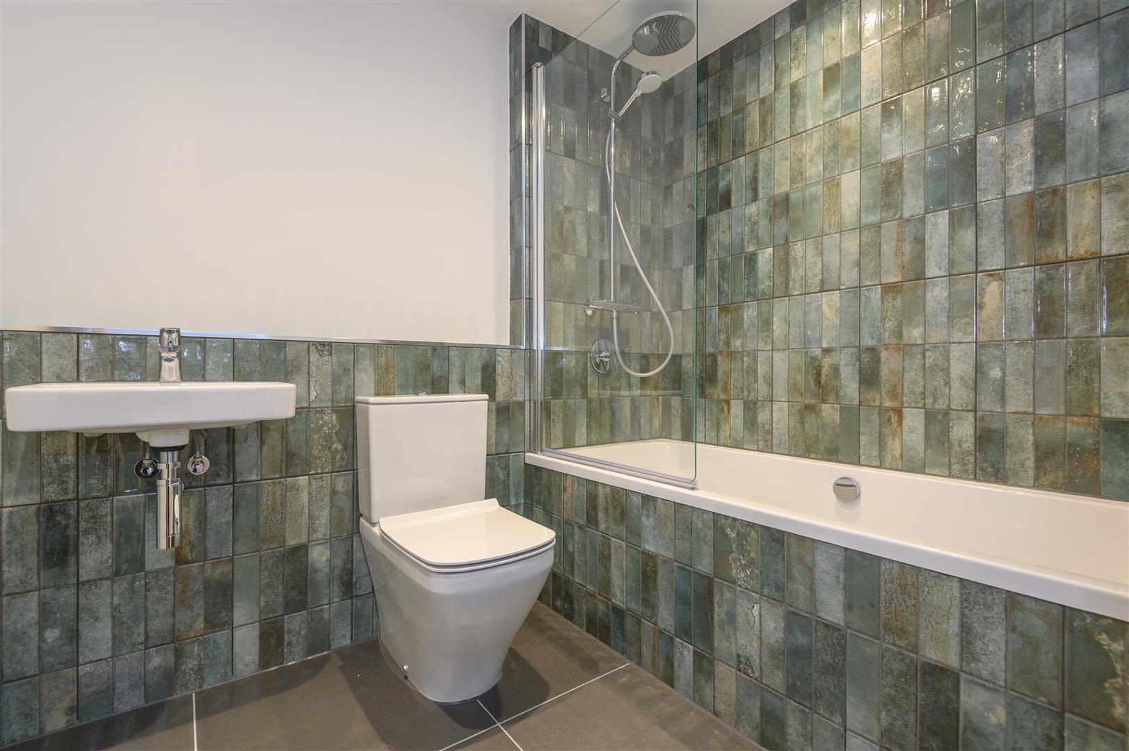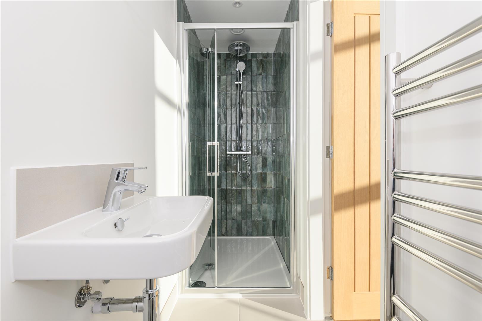 - High-spec green kitchen with quartz worktops and integrated appliances