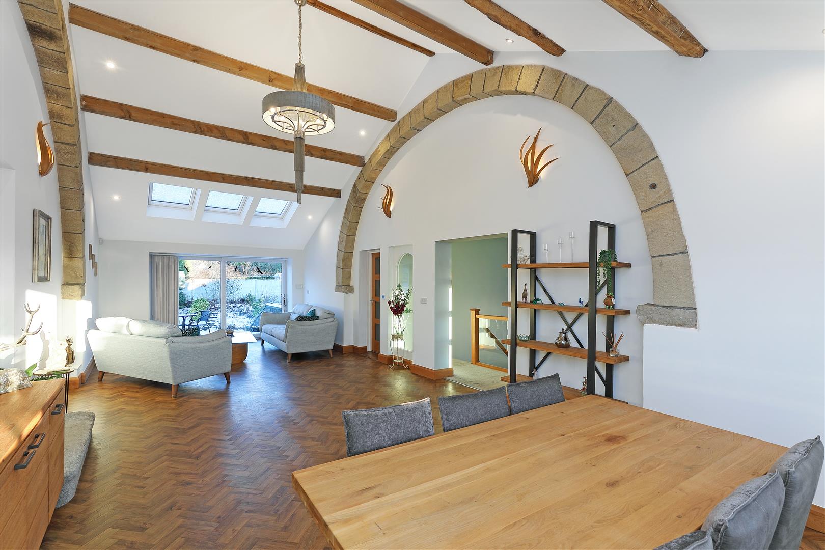 - Striking central living space with vaulted ceiling, original beams and herringbone flooring